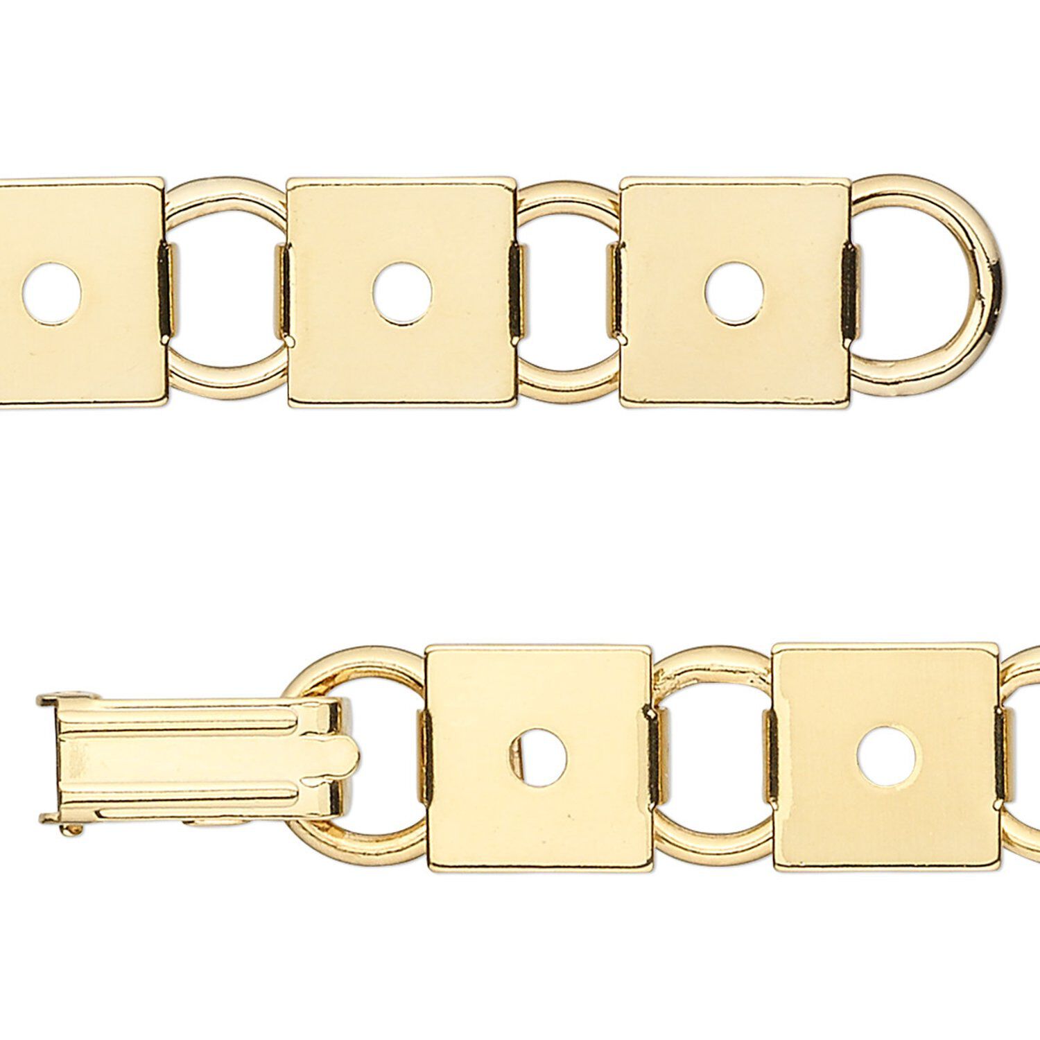 Bracelet component, gold-plated steel, (12) 10mm square link settings, 7 inches with fold-over clasp. Sold per pkg of 2.