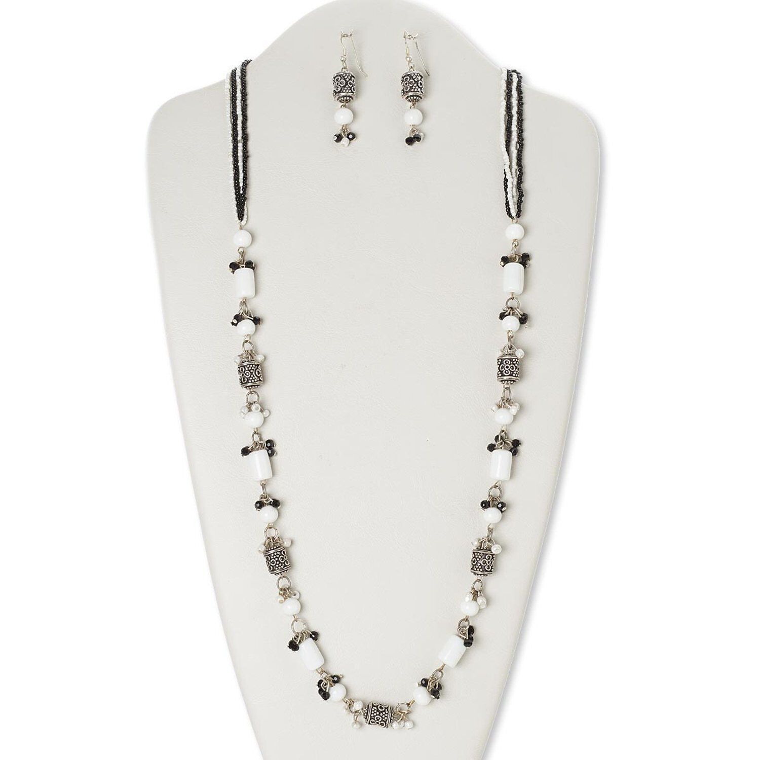 Necklace and earring set, glass / silver-finished steel / brass / antiqued silver-finished brass, black and white, 32 inches with lobster claw clasp, 2-1/4 inch earrings with fishhook ear wire. Sold per set.