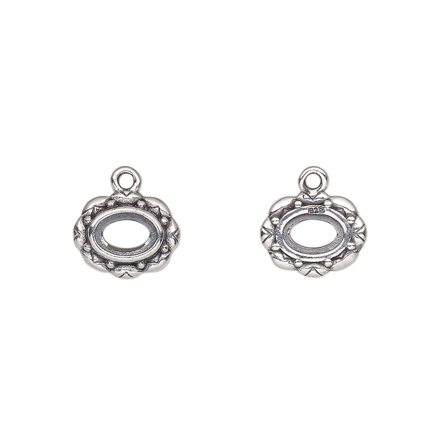 Drop, antiqued sterling silver, 10.5x8.5mm overall with 6x4mm oval setting and flower design with open back. Sold individually.