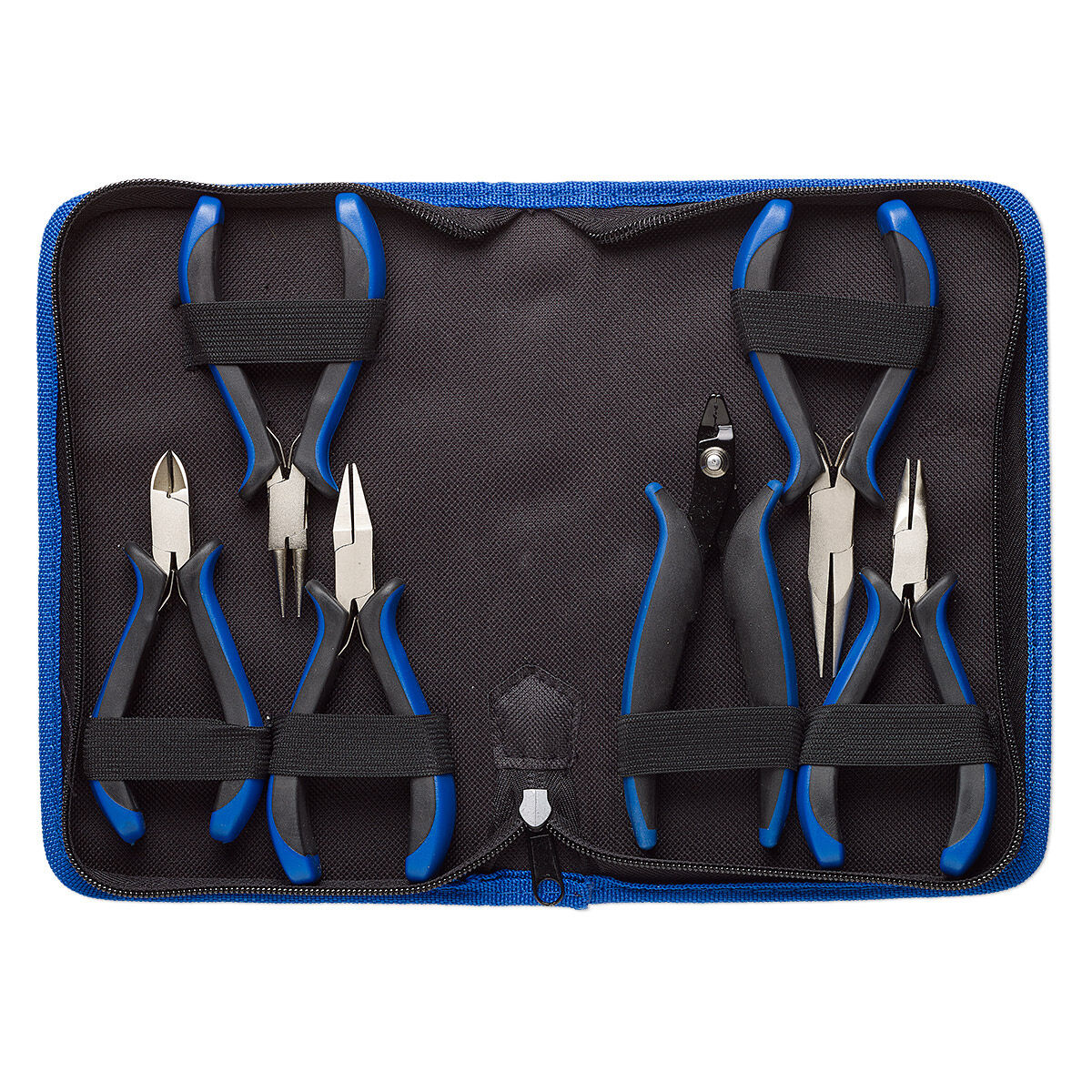 Pliers set, curved chain-nose / chain-nose / round-nose / flat-nose / side-cutter / crimp, plastic / polyester / nickel-plated steel, black and blue, 4-1/2 to 5-1/2 inches with 8-1/2 x 5-1/4 x 1-1/2 inch case. Sold per 6-piece set.