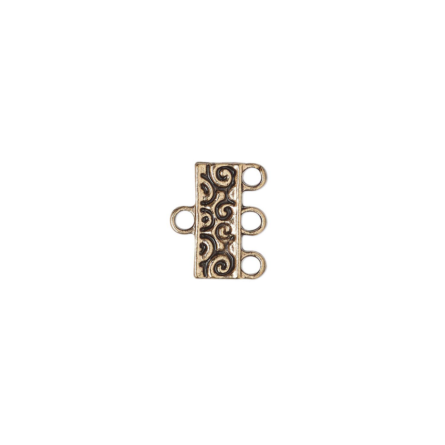 End bar, antique gold-finished "pewter" (zinc-based alloy), 12x5mm double-sided rectangle with swirl design and 3 loops. Sold per pkg of 12.