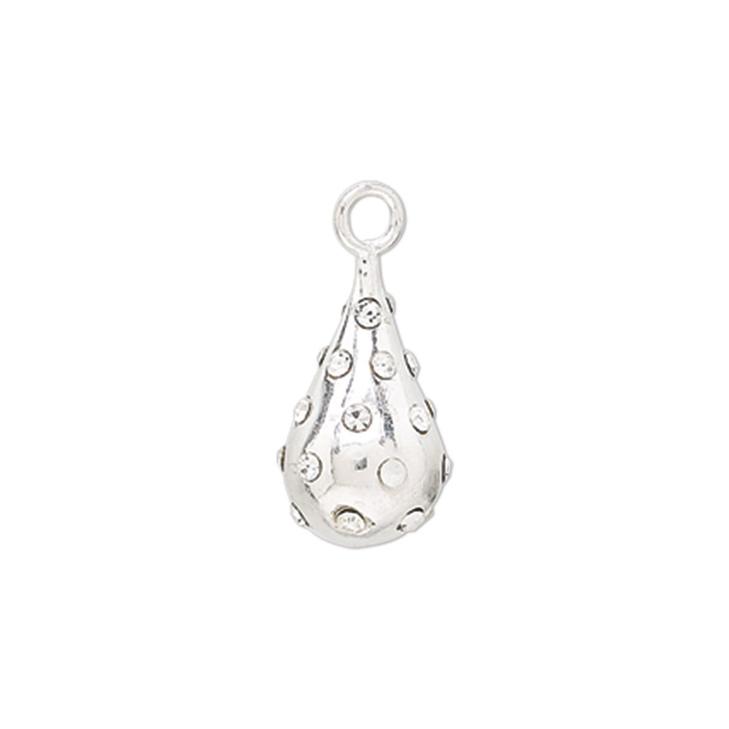 Polished sterling silver drop has a top loop for easily accommodating jumprings or stringing material. The precious metal glint is enhanced by faceted rhinestones in a clear color.