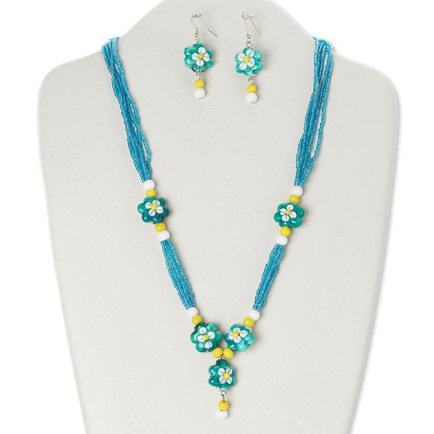 Colorful lampworked glass flowers accent this necklace and earring set strung with blue seed beads. Colors can include green, white, yellow and blue. Sizes, shapes and colors may vary with handcrafted items.