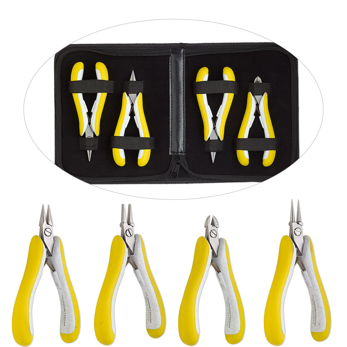 Pliers set, Lindstrom® EX series, flush-cutters / flat-nose / round-nose / chain-nose, steel / rubber / plastic, yellow and grey, 5 to 5-1/4 inches. Sold per 4-piece set.