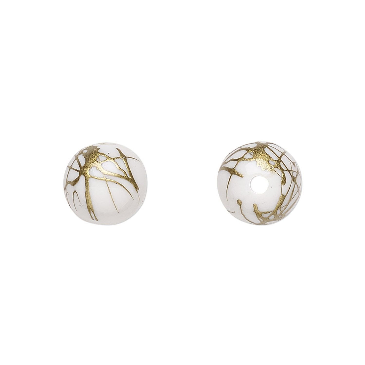 Bead, acrylic, white and gold, 10mm round with swirls. Sold per pkg of 200.