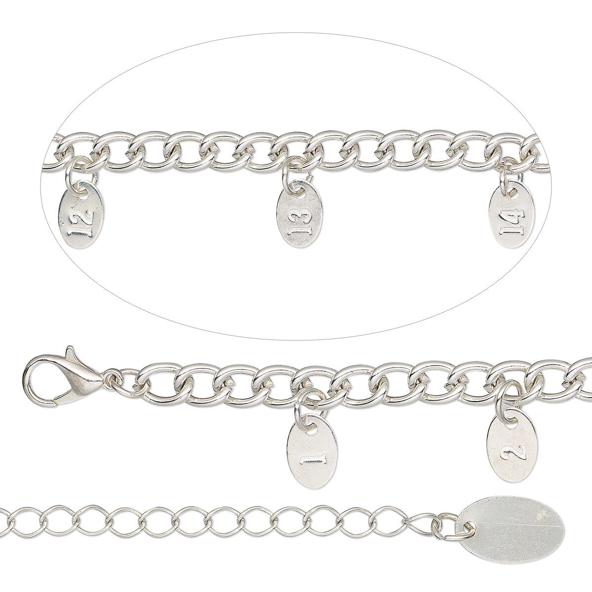 Bracelet measuring chain, silver-finished steel, 5.4mm curb, 14 inches with 9x6mm tags and 3-inch extender chain with lobster claw clasp. Sold individually.