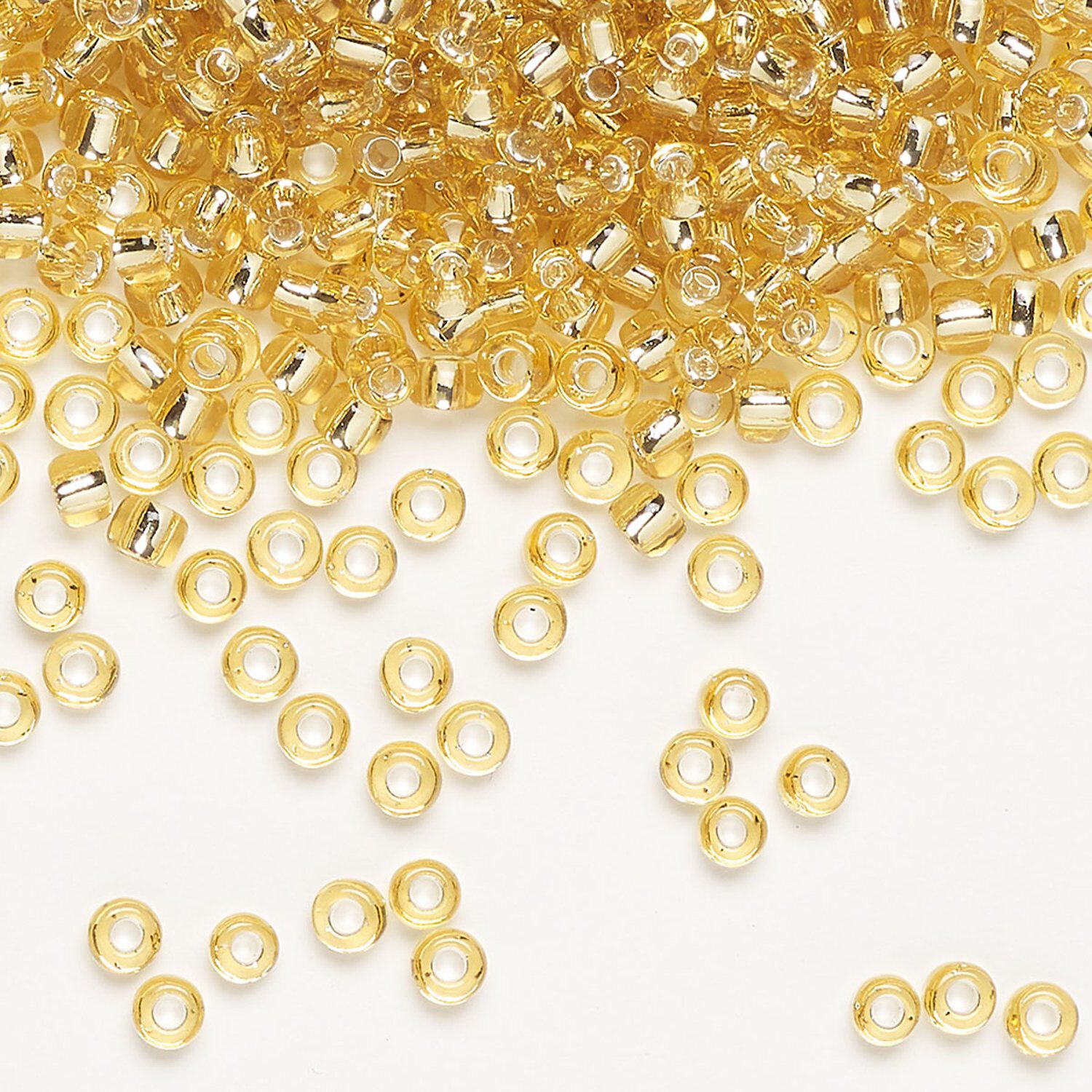 Seed bead, Dyna-Mites™, glass, silver-lined translucent light gold, #8 round. Sold per 1/2 kilogram pkg.