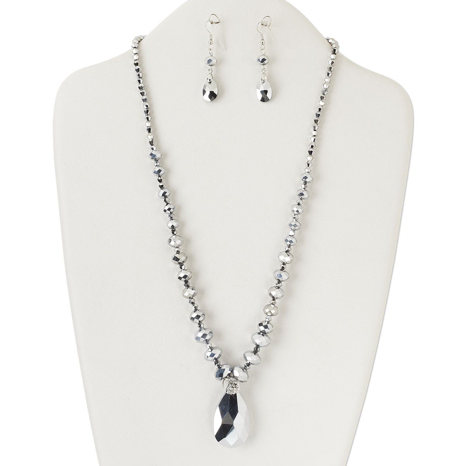 Necklace and earring set, silver-finished "pewter" (zinc-based alloy) / brass / steel / glass, clear with full-silver finish, 38x22mm teardrop, 22 inch with tab clasp, 35x10mm earrings with fishhook ear wire. Sold per set.