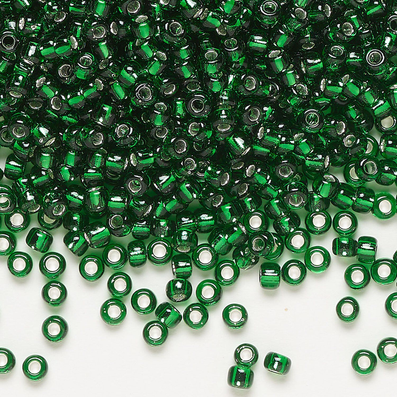 Seed bead, Dyna-Mites™, glass, silver-lined translucent emerald green, #8 round. Sold per 1/2 kilogram pkg.
