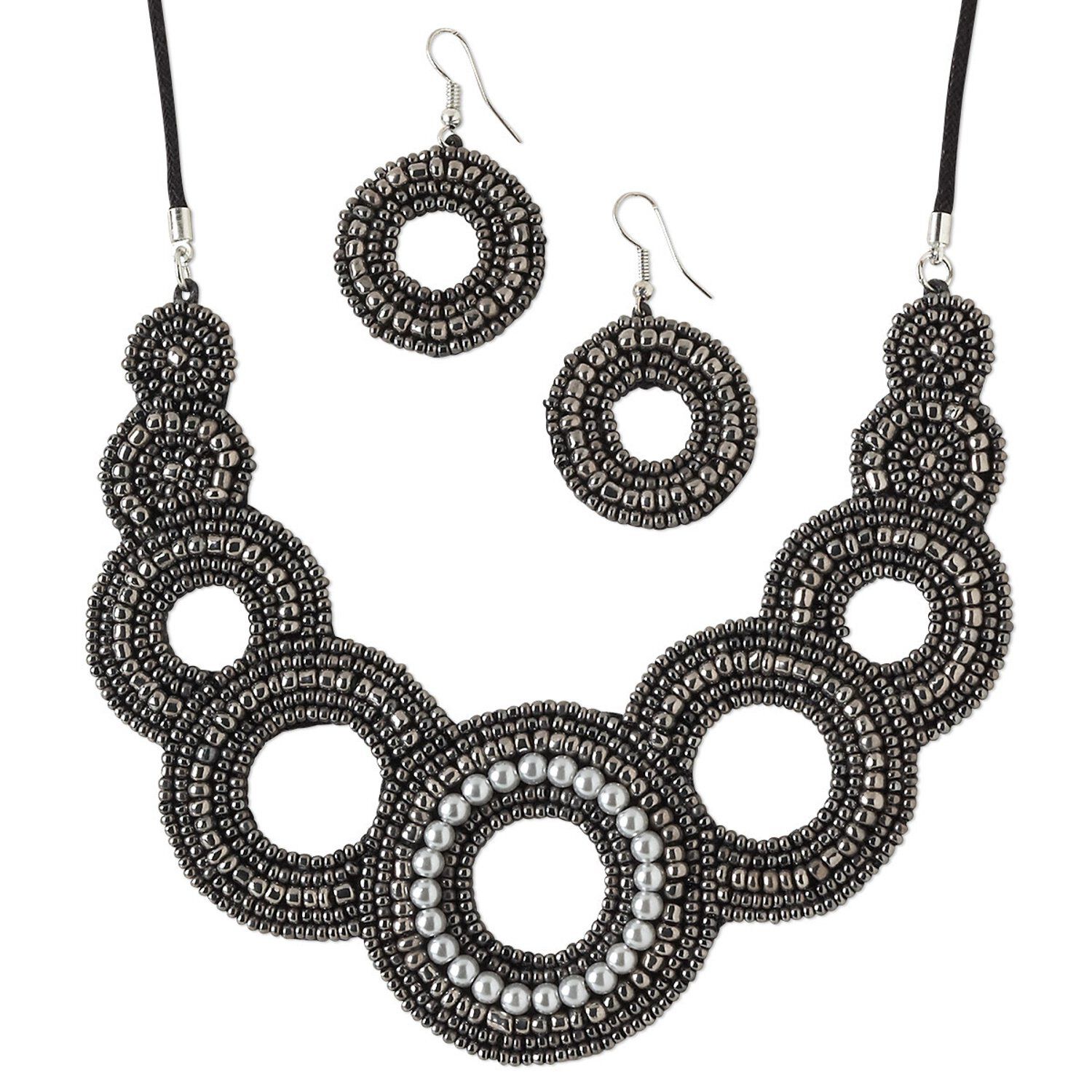 Necklace and earring set uses shades of grey in seed beads and glass-based pearls on a velveteen backing to create mandala-style round components that mesmerize the eye. Necklace features adjustable knotted closure.