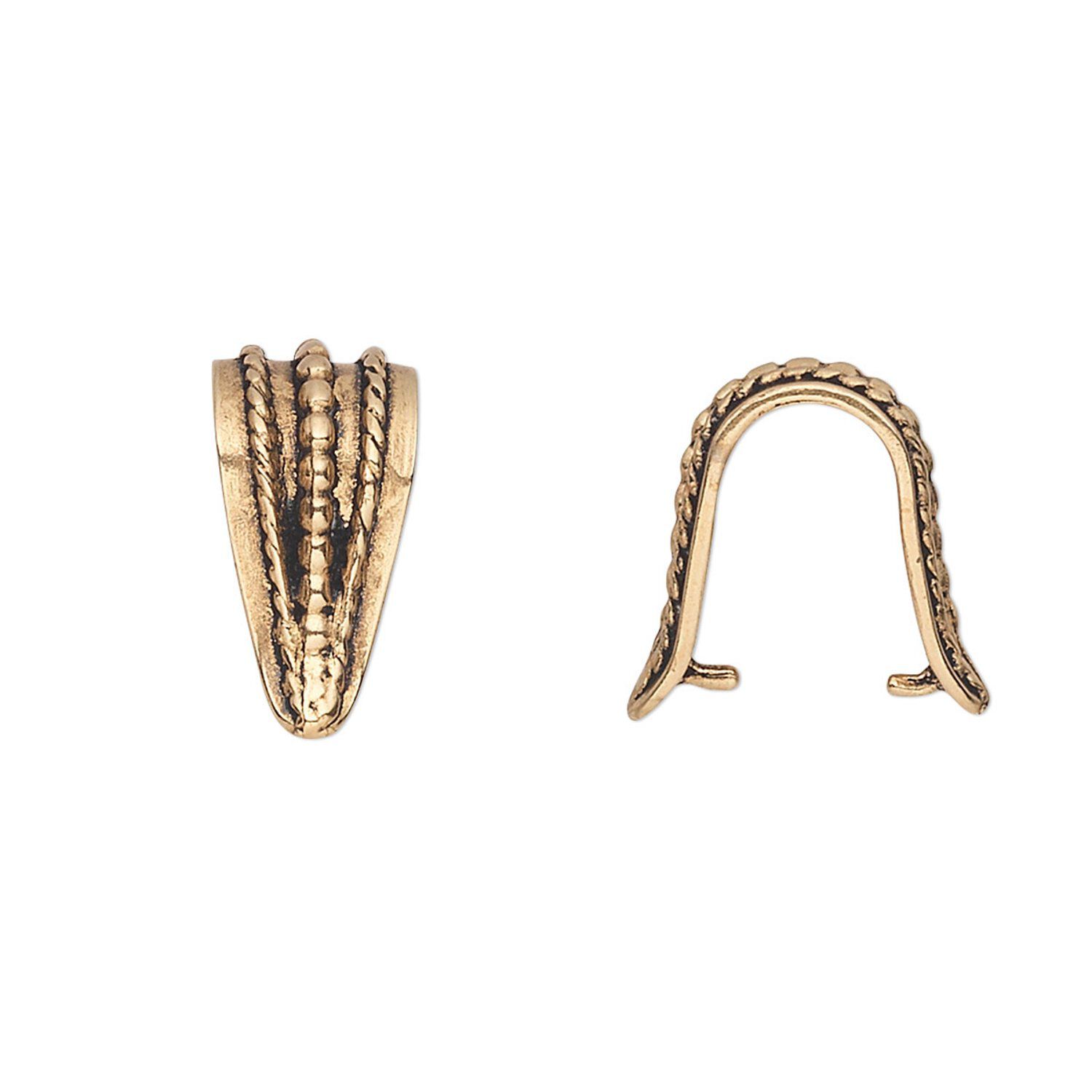 An alloy of copper and zinc, antiqued brass ice-pick bail has top loop. Ideal for briolettes, teardrops and other top-drilled shapes. Due to the raw brass material, natural surface blemishes--normally hidden by a plating--may be apparent. Grip length is 12mm. A small amount of adhesive can be used for added security.