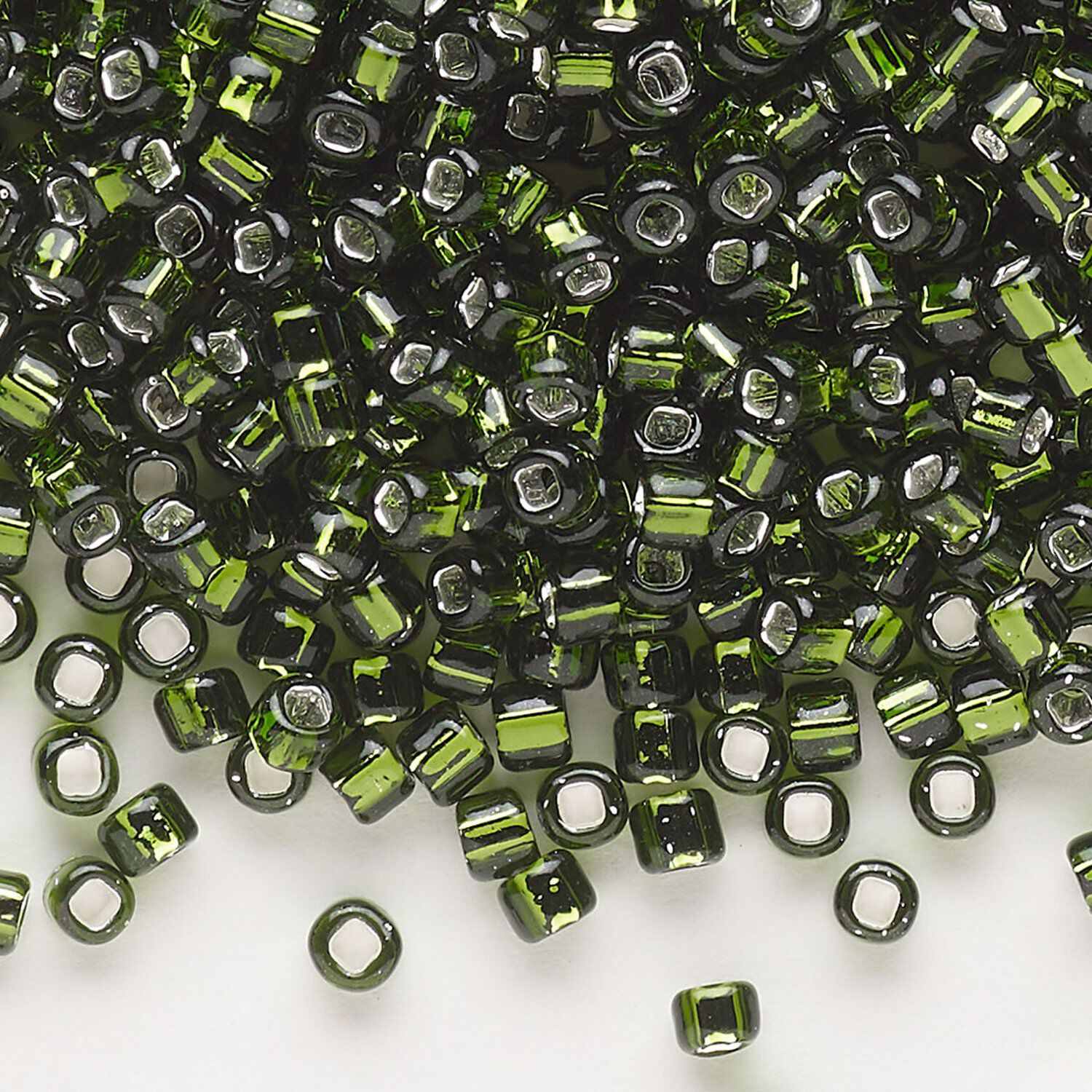 Seed bead, Dyna-Mites™, glass, silver-lined translucent olive green, #6 round with square hole. Sold per 1/2 kilogram pkg.