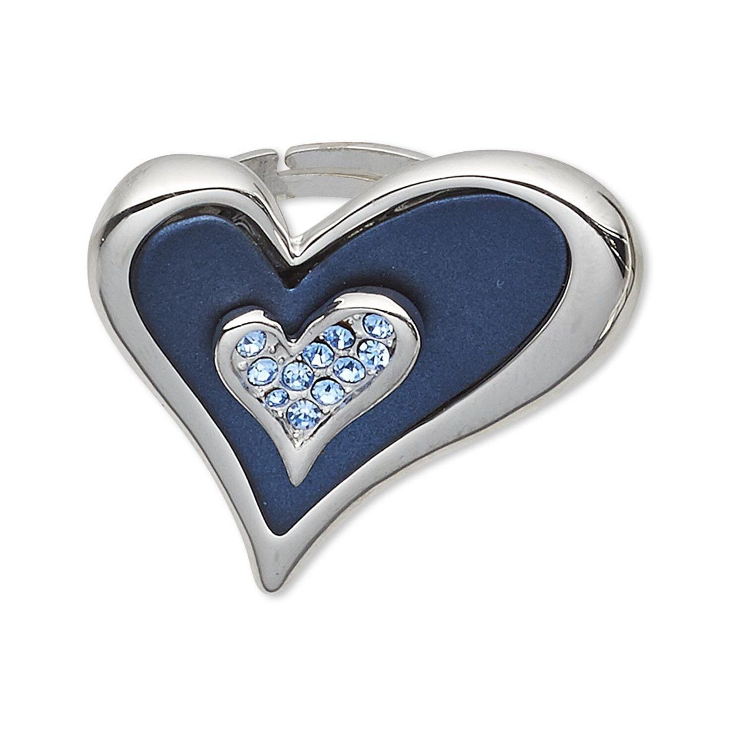 Fun and fashionable adjustable ring features a heart with a dark blue rubber inlay and a second inset heart with blue Czech glass rhinestones. Colors, shapes and sizes may vary in each lot.