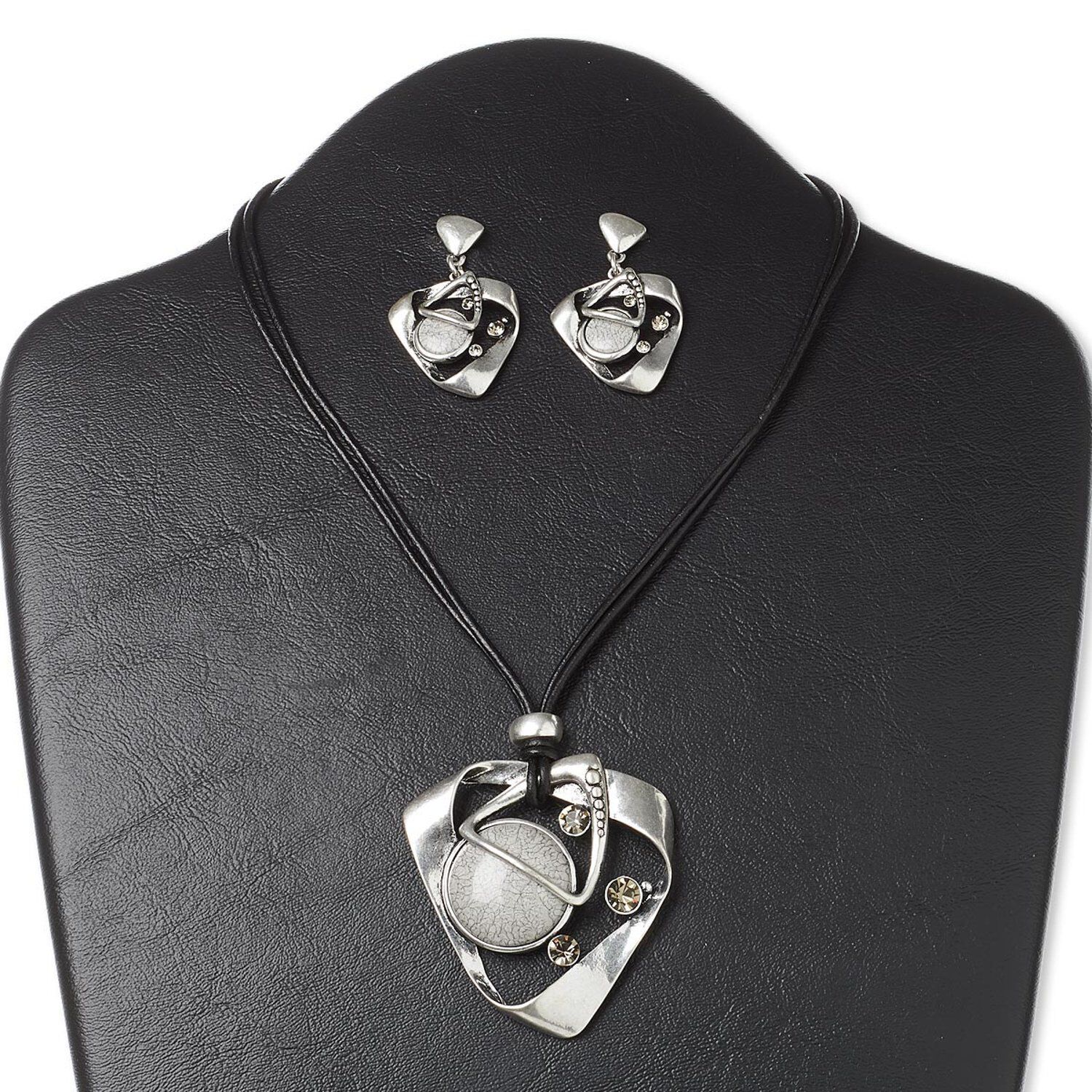 Necklace and earring set, 2-strand, resin / leather (dyed) / antiqued silver-finished steel and "pewter" (zinc-based alloy), black / grey / smoke, 57x53mm twisted triangle, 16 inches with 3-inch extender chain and lobster claw clasp, 1-5/8 inch earrings with post. Sold per set.