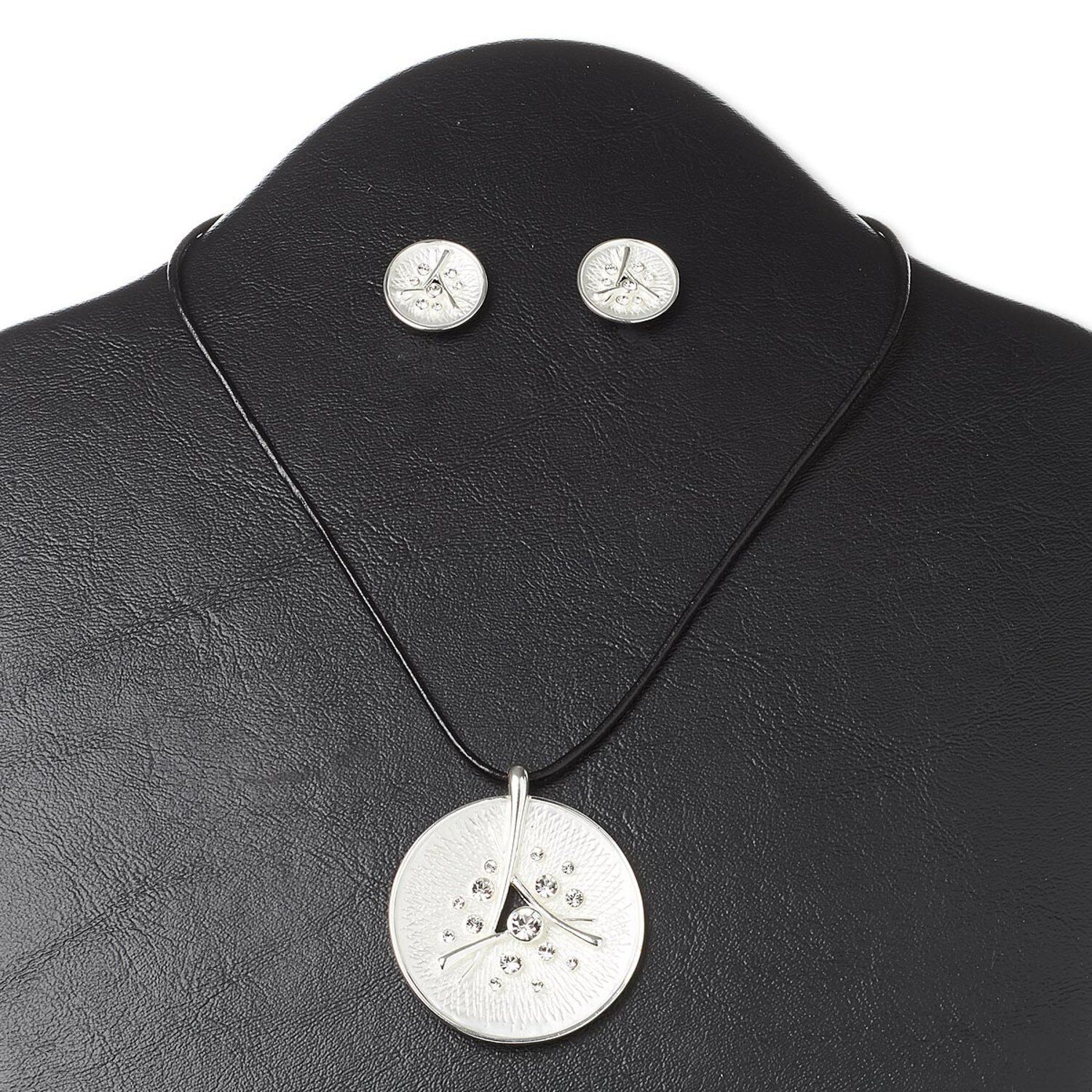 Necklace and earring set, Everyday Jewelry, crystals / leather (dyed) / silver-finished steel and "pewter" (zinc-based alloy), black and crystal clear, 44mm round, 16-inch necklace with 3-inch extender chain and lobster claw clasp, 14mm round earrings with post. Sold per set.