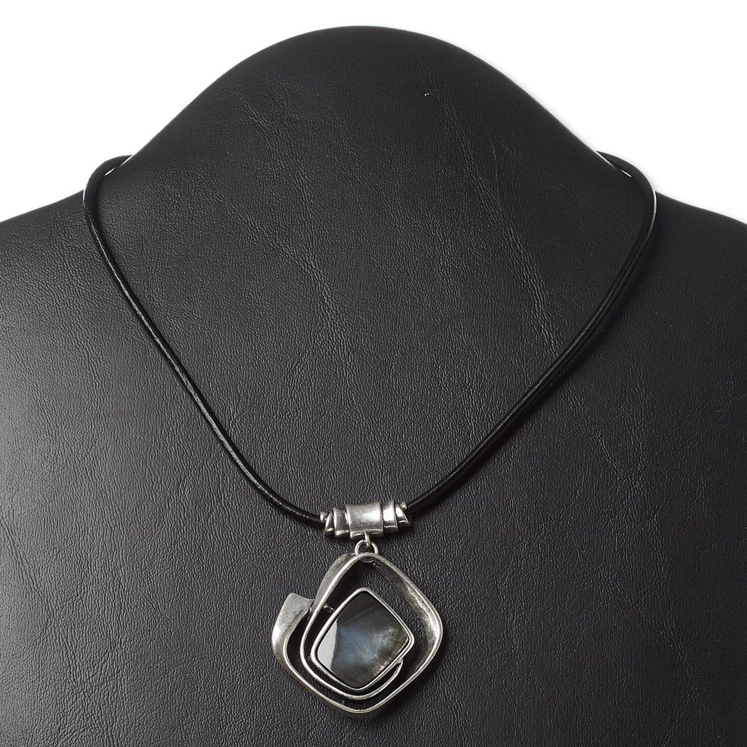 Necklace, leather / black lip shell (natural / dyed) / antique silver-plated "pewter" (zinc-based alloy) and steel, 42x41mm twisted diamond, 16 inches with 3-inch extender chain and lobster claw clasp. Sold individually.