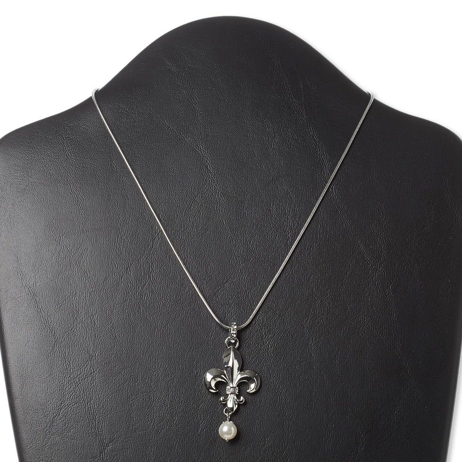 Necklace, glass rhinestone / acrylic pearl / imitation rhodium-finished "pewter" (zinc-based alloy), clear, 40x25mm fleur-de-lis, 16 inches with 3-inch extender chain and lobster claw clasp. Sold individually.