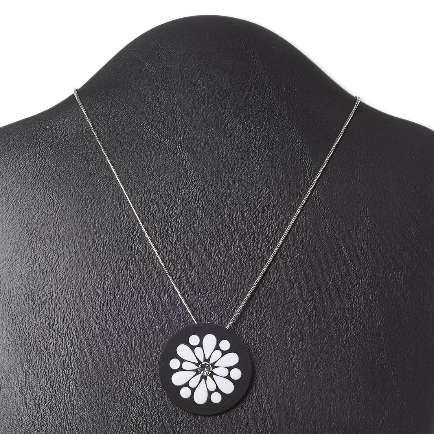 Necklace, Everyday Jewelry, crystals / enamel / imitation rhodium-finished "pewter" (zinc-based alloy), black / white / crystal clear, 40mm painted round, 16 inches with 3-inch extender chain and lobster claw clasp. Sold individually.