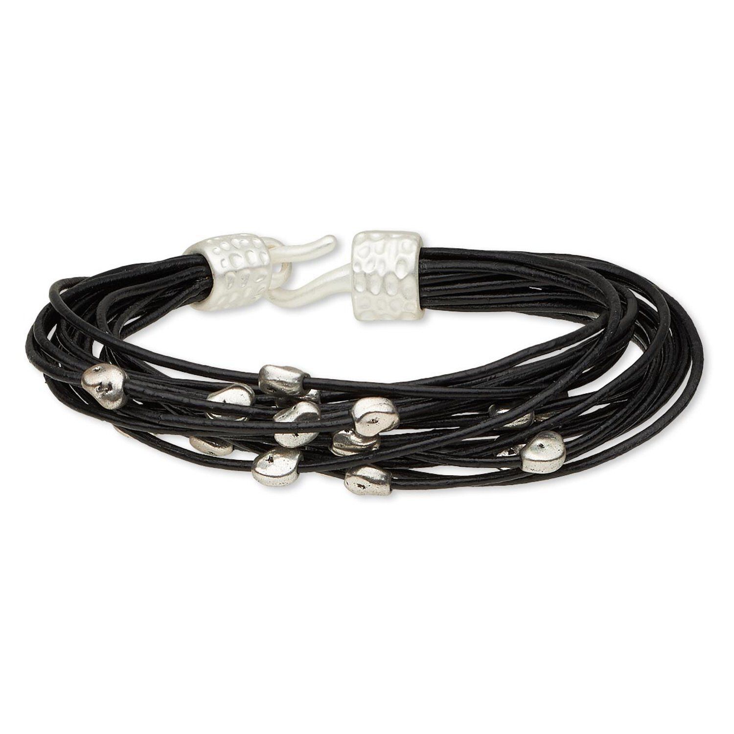 Bracelet, 16-strand, leather (dyed) and silver-finished "pewter" (zinc-based alloy), black, 17mm wide with matte mini nugget, 7-1/2 inches with hook-and-eye clasp. Sold individually.