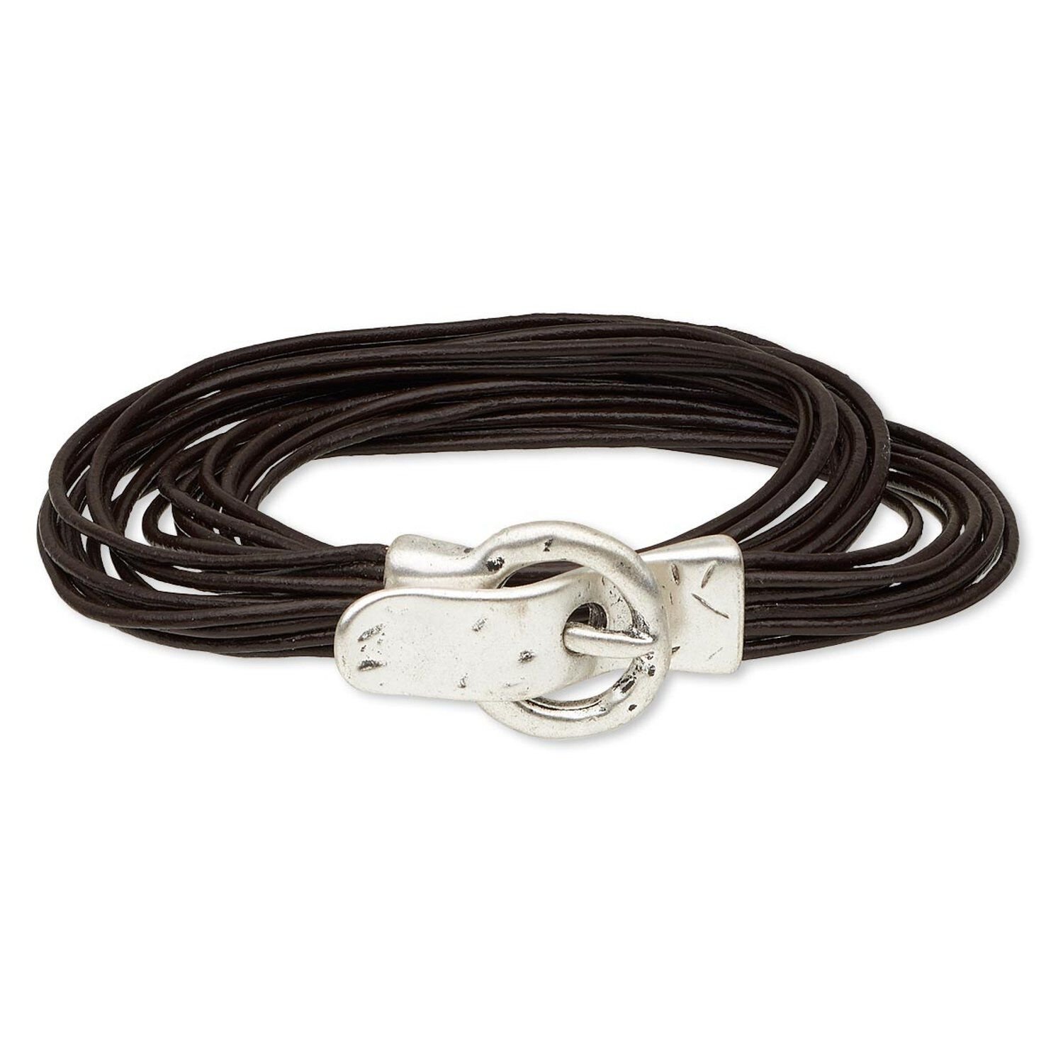 Bracelet, 10-strand wrap, leather (dyed) and antique silver-plated "pewter" (zinc-based alloy), brown, 10mm wide, 7 inches with 38x21mm magnetic buckle-style closure. Sold individually.
