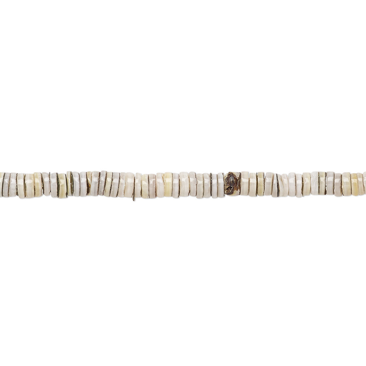 Bead, green shell (natural), 2-3mm hand-cut heishi, Mohs hardness 3-1/2. Sold per 24-inch strand.