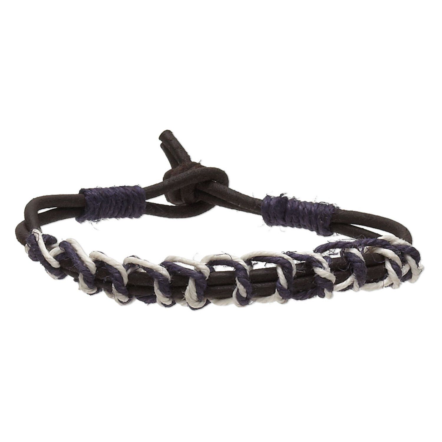Bracelet, leather (dyed) / waxed cotton cord / flax, dark brown / navy blue / white, 8mm wide knotted design, 7 inches with knot closure. Sold per pkg of 2.