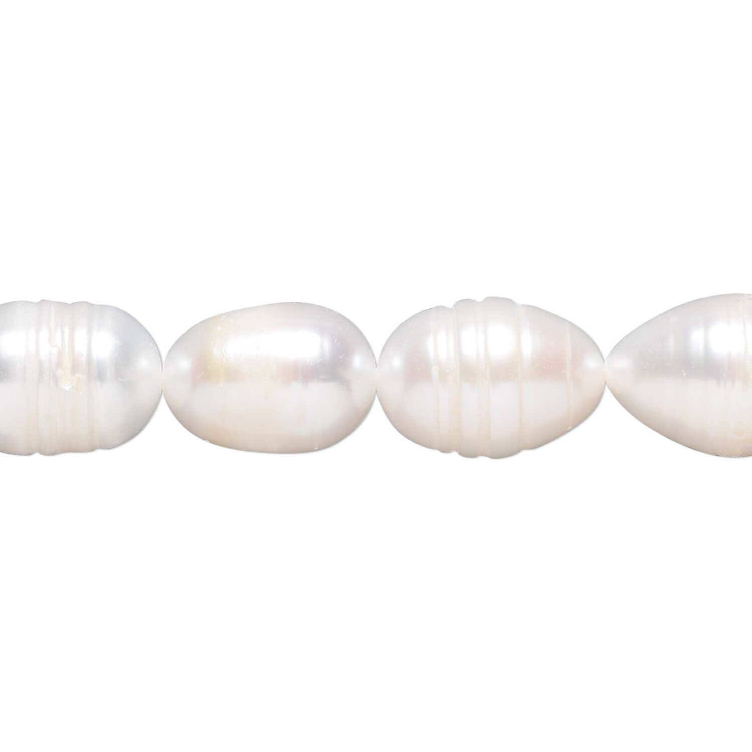 Pearl, cultured freshwater (bleached), white, 9-11mm rice, D- grade, Mohs hardness 2-1/2 to 4. Sold per 14-inch strand.