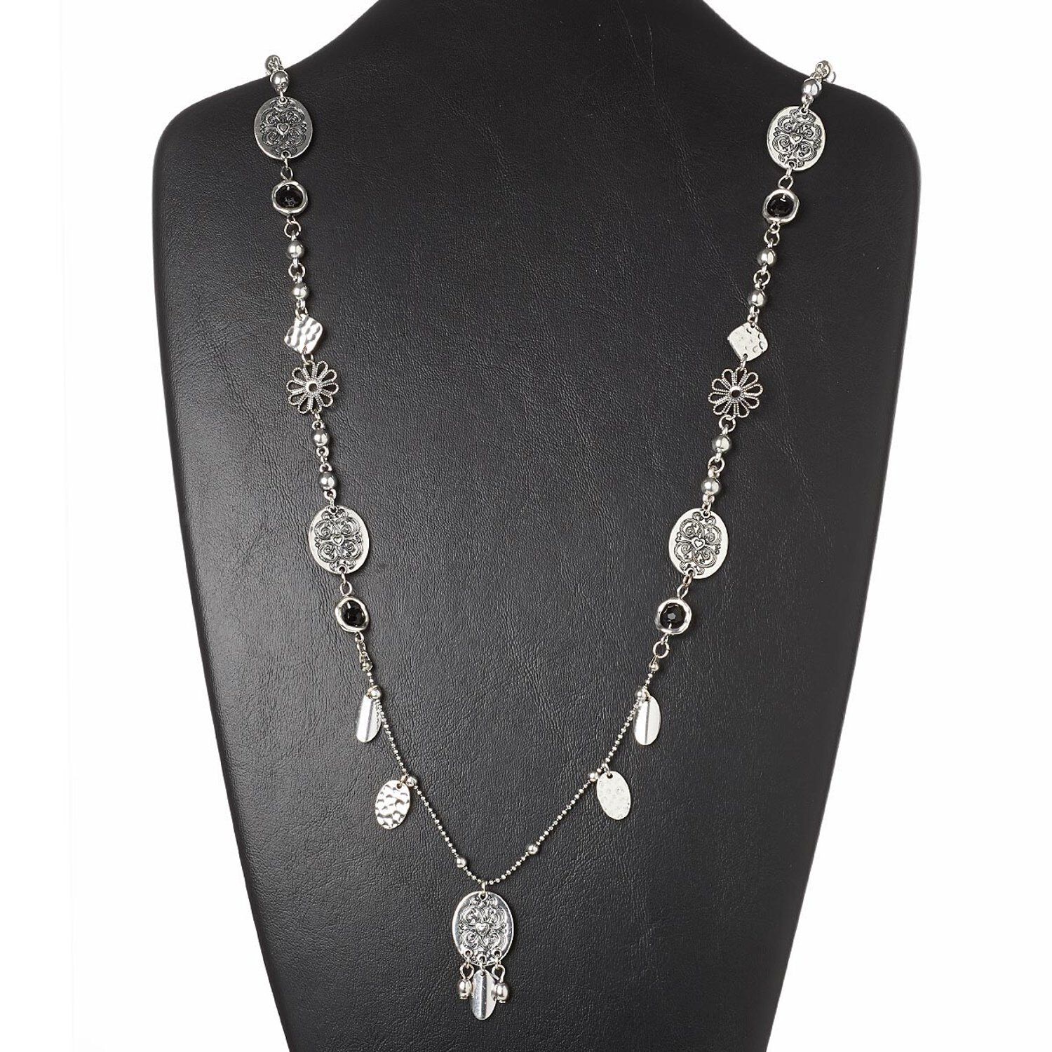 Necklace, glass / silver-coated plastic / silver-plated brass / antique silver-plated brass and "pewter" (zinc-based alloy), black, 1-1/2 inch dangle with oval and flowers, 36 inches with lobster claw clasp. Sold individually.