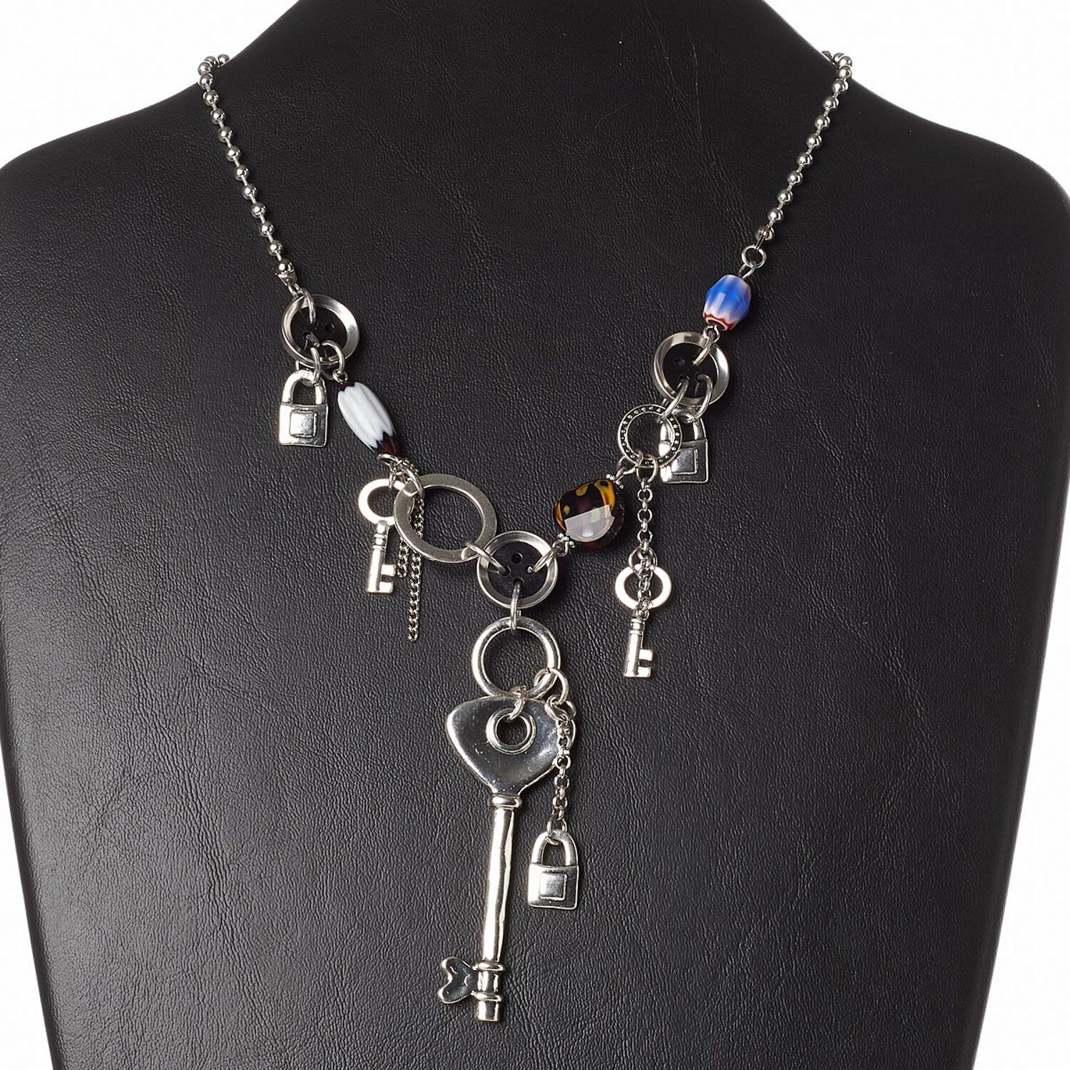 Necklace, glass / resin / silver- / antique silver-plated brass / "pewter" (zinc-based alloy) / steel, multicolored, 64x25mm key, 15 inches with 3-inch extender chain and lobster claw clasp. Sold individually.