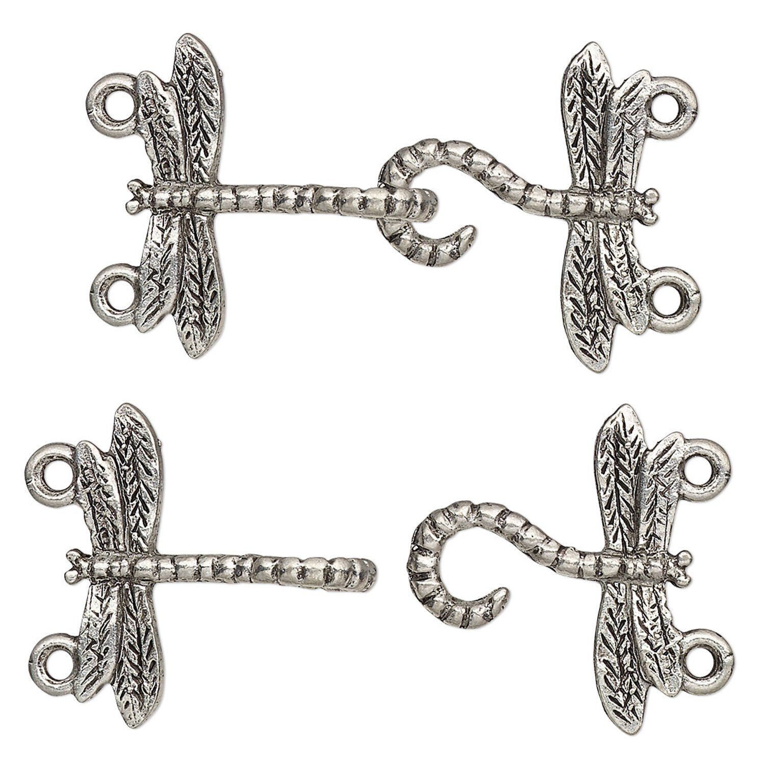 Clasp, 2-strand hook-and-eye, antiqued pewter (tin-based alloy), 33x18mm dragonfly. Sold per pkg of 2.
