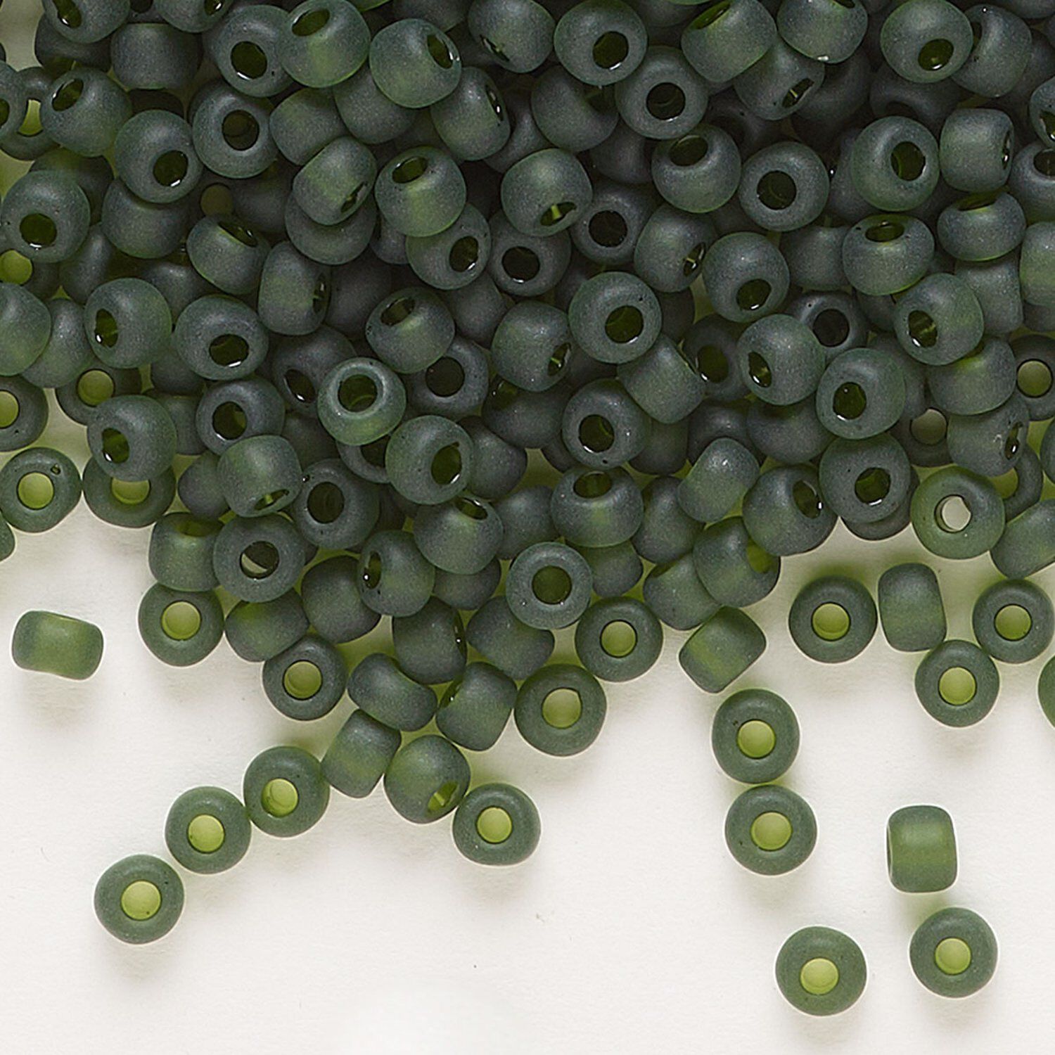 Seed bead, Dyna-Mites™, glass, transparent matte olive green, #6 round. Sold per 1/2 kilogram pkg.