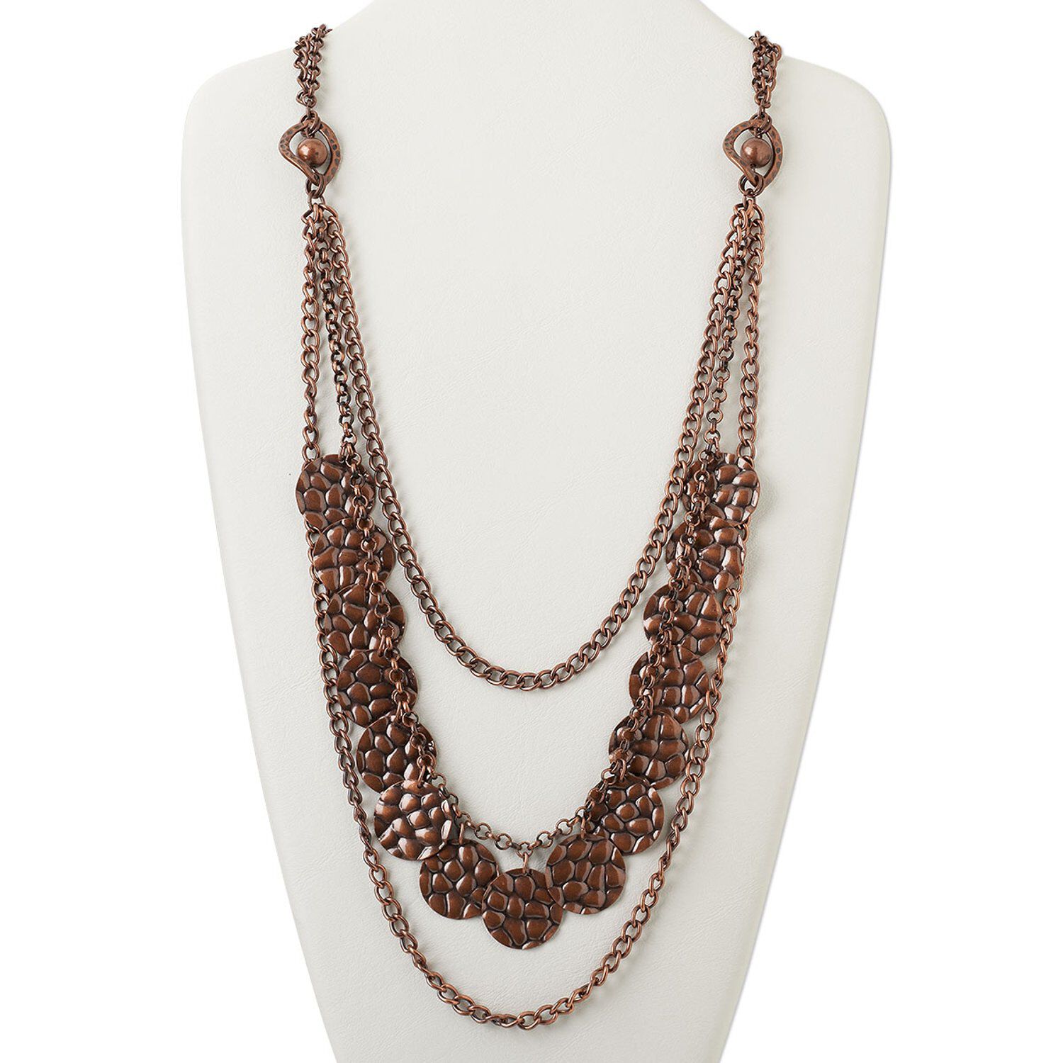 Ready-to-wear necklace features antiqued copper-finished brass chain with hammered flat round drops. This necklace is ideal for gift-giving, counter sales or extending current jewelry lines. The overall necklace length measures 51 inches.