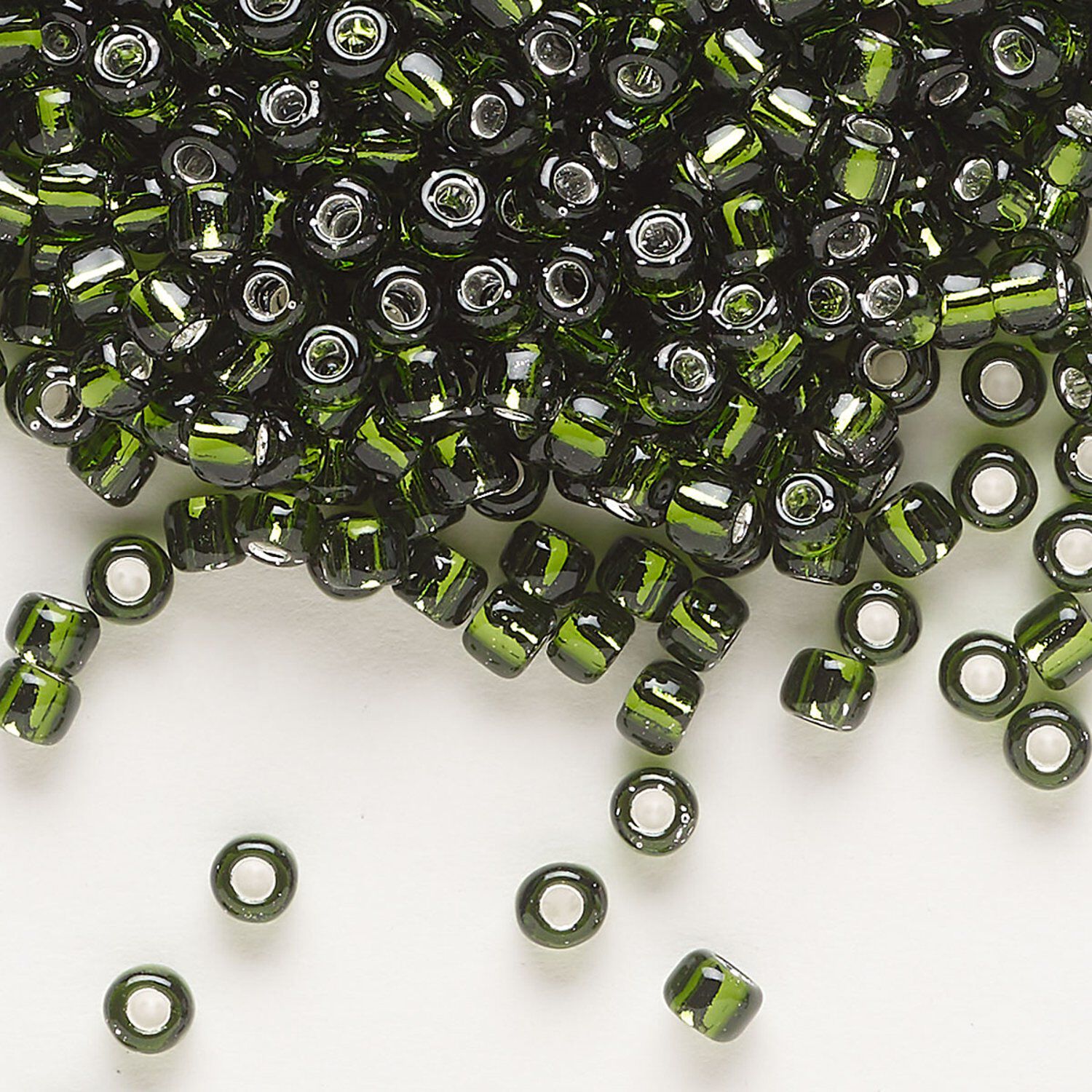Seed bead, Dyna-Mites™, glass, transparent silver-lined olive green, #6 round. Sold per 1/2 kilogram pkg.