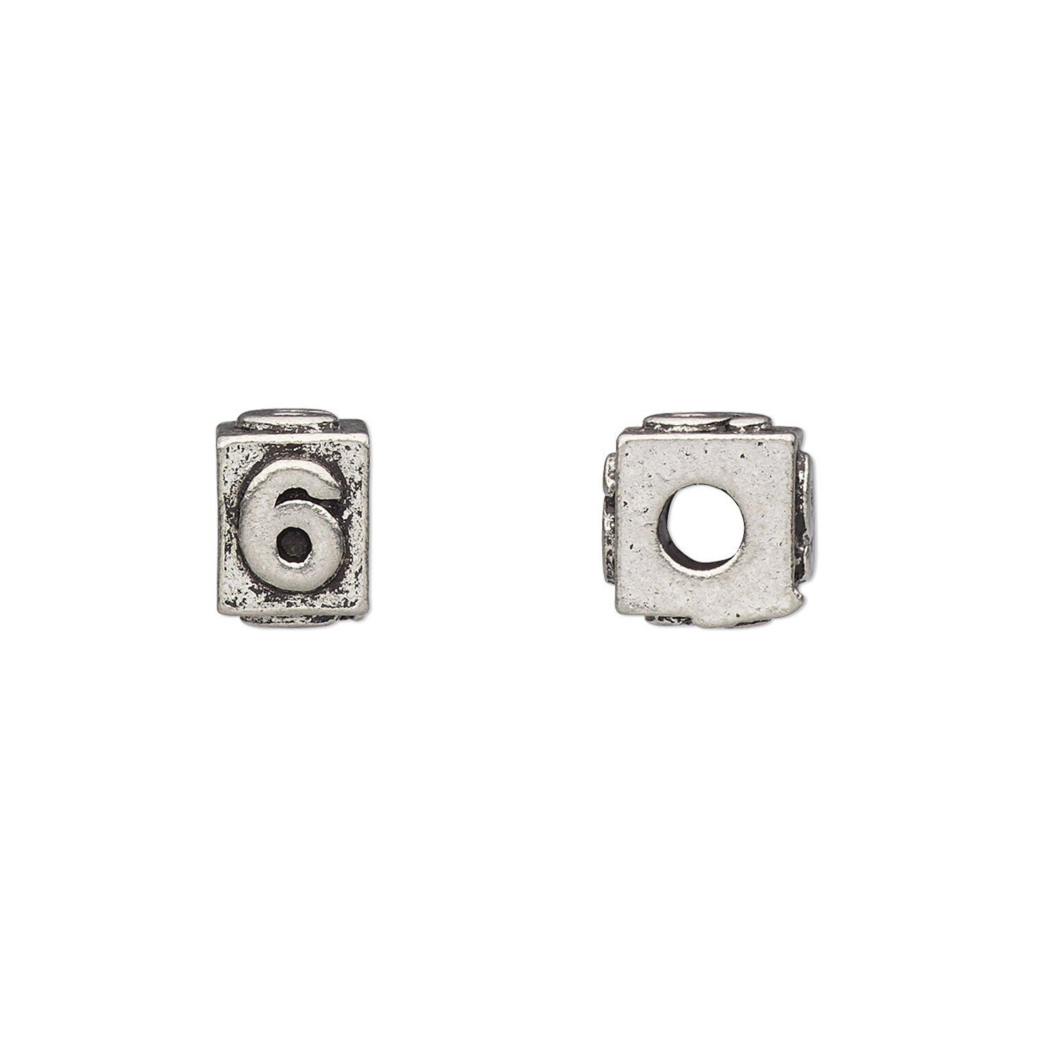 These pewter (tin-based alloy) beads have numbers on four sides, and have large holes for stringing on cord or chain. Ideal for mother's bracelets and necklaces. Sizes and color may vary. Bead has an average hole size of approximately 3mm.