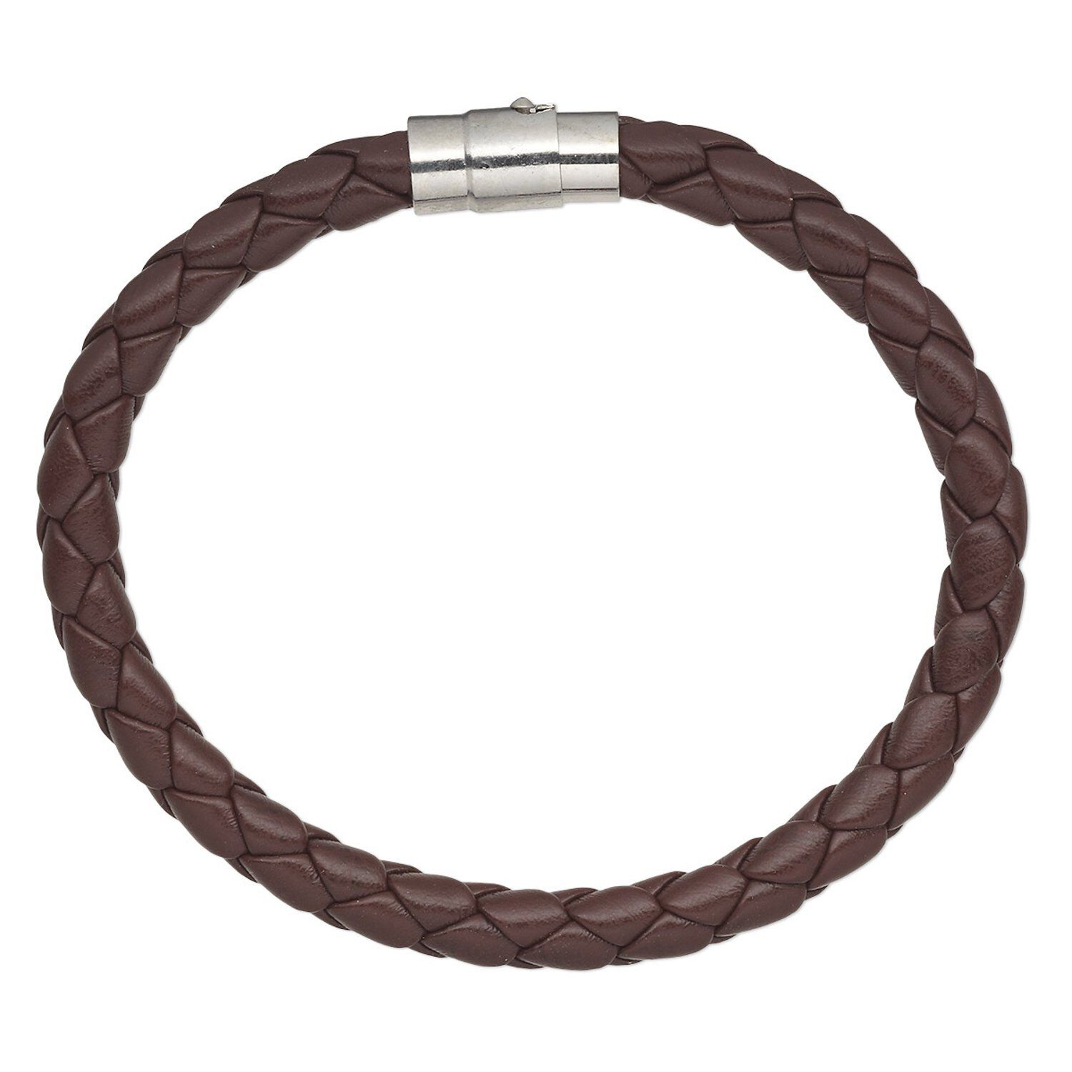 Bracelet, leatherette and imitation rhodium-plated brass, brown, 6mm wide braided, 7 inches with magnetic locking tube clasp. Sold individually.