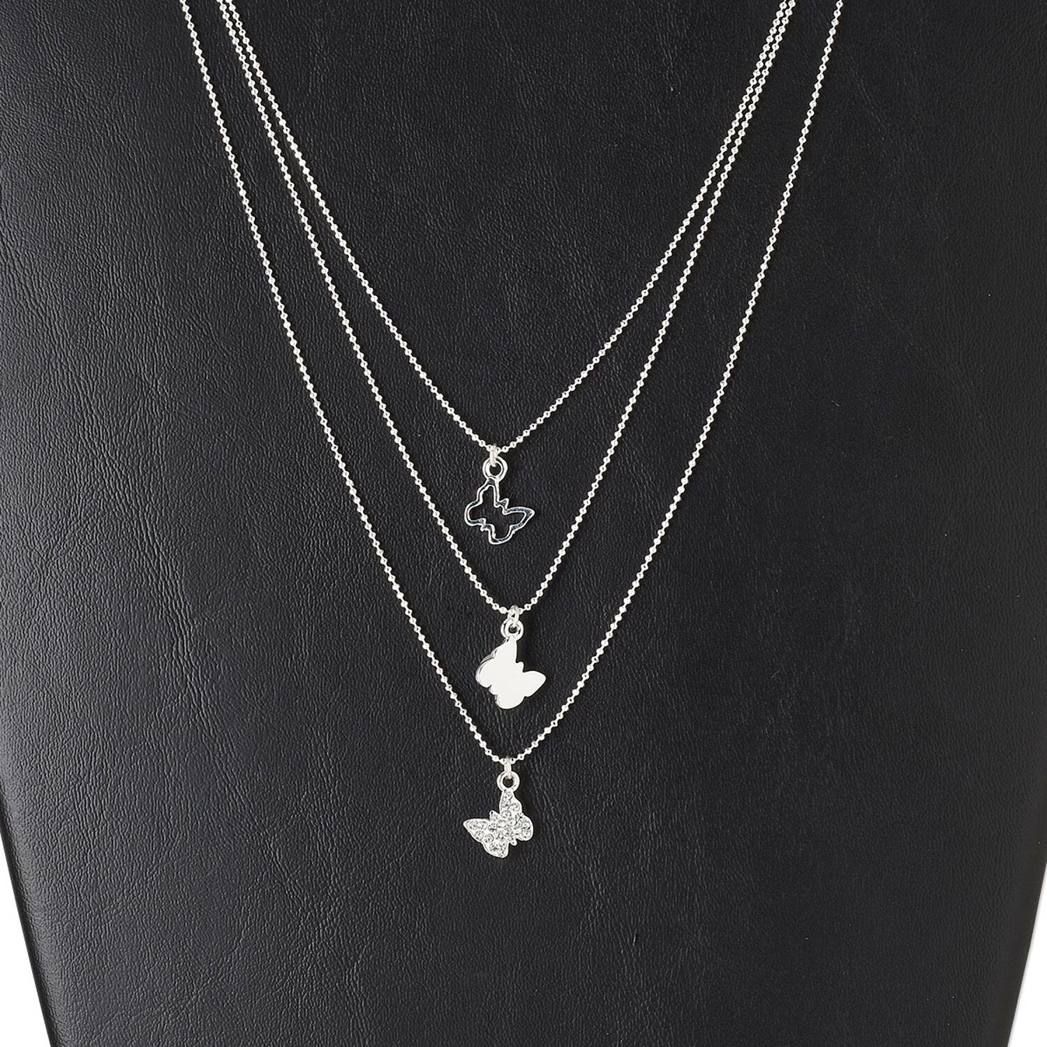 This multi-strand ball chain necklace features complementary butterfly components in a matching silver tone--an eye-catching combination and a quick resale. The overall necklace length measures 21-1/2 inches.