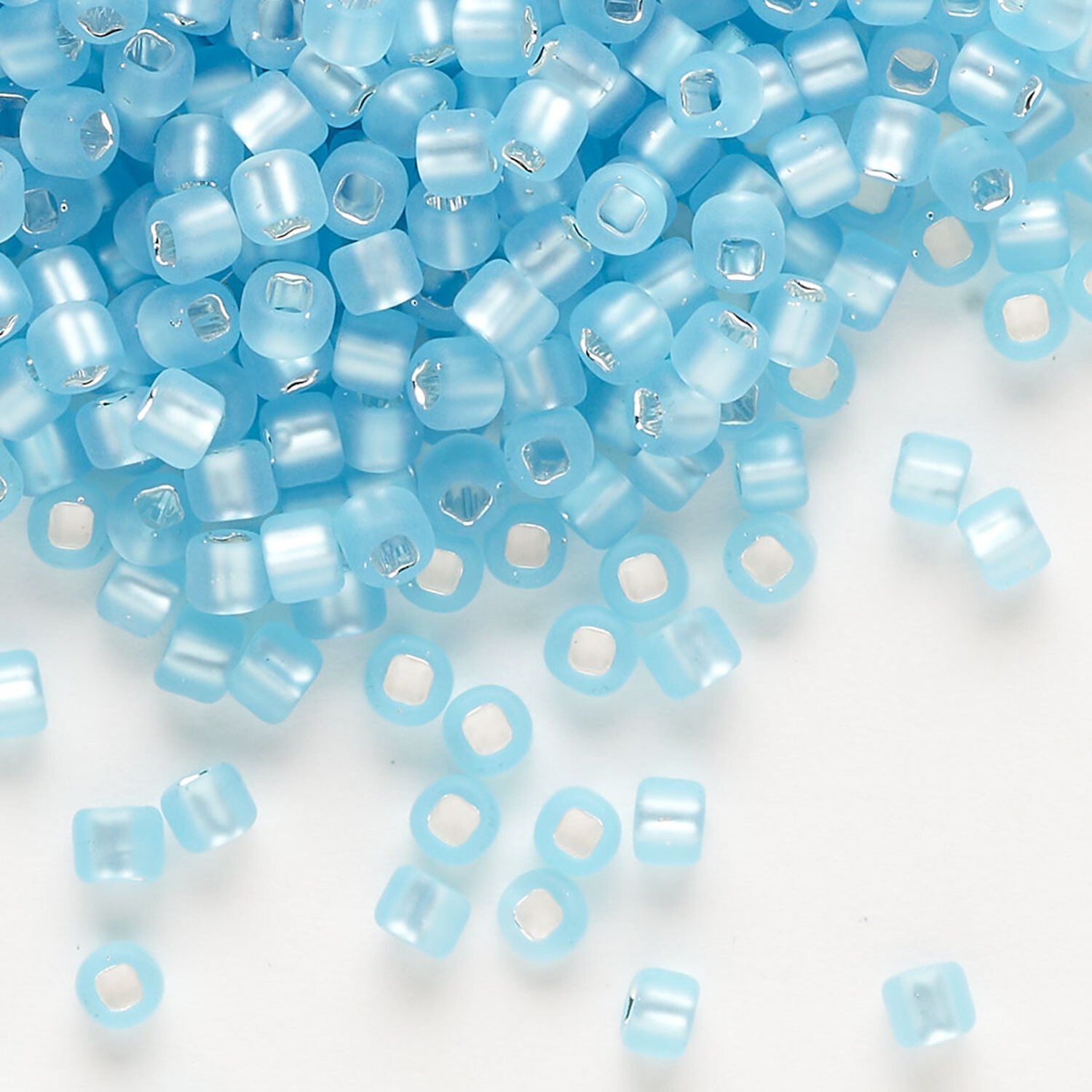 Seed bead, Dyna-Mites™, glass, silver-lined translucent matte light aqua, #6 round with square hole. Sold per 1/2 kilogram pkg.