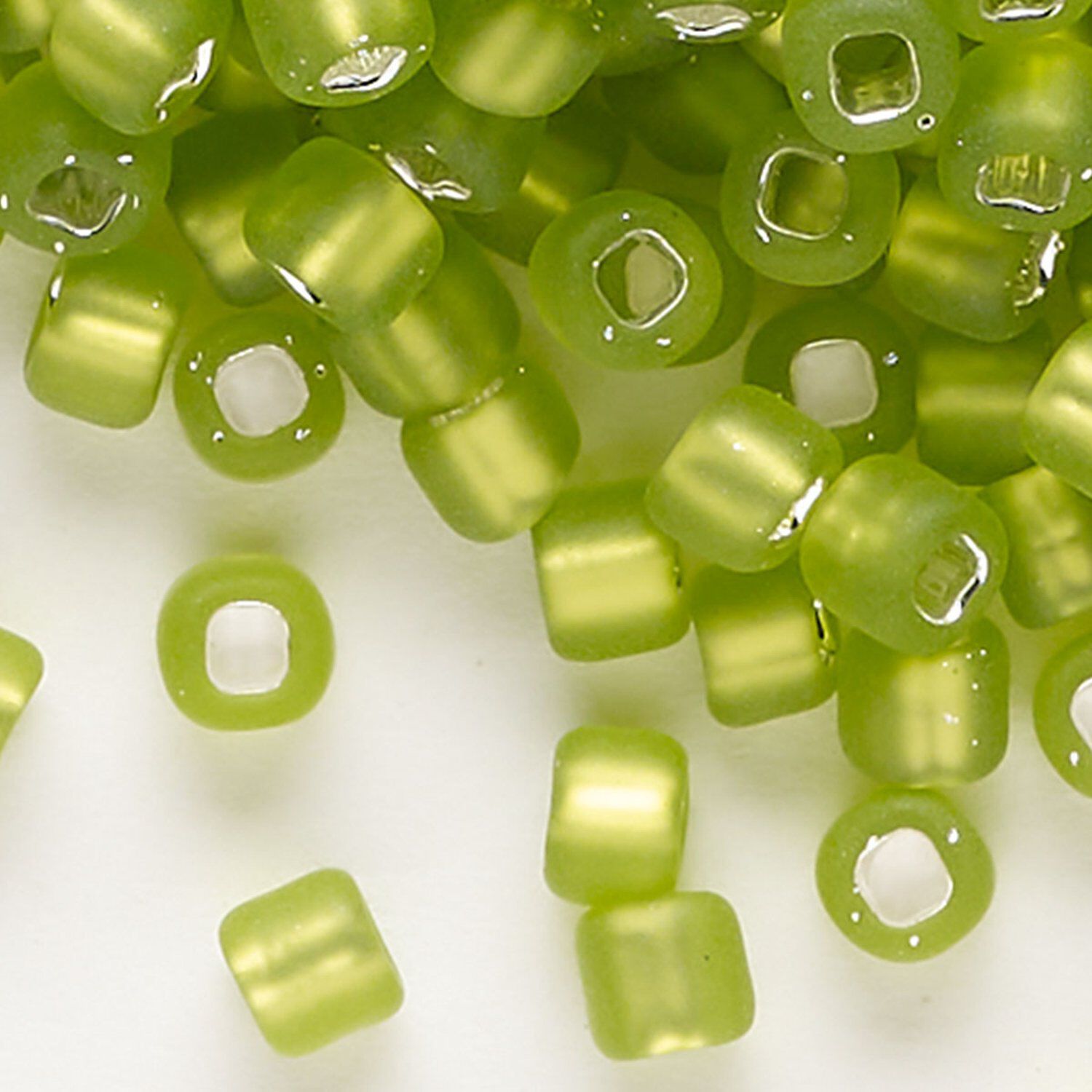 Seed bead, Dyna-Mites™, glass, silver-lined translucent matte light green, #6 round with square hole. Sold per 1/2 kilogram pkg.