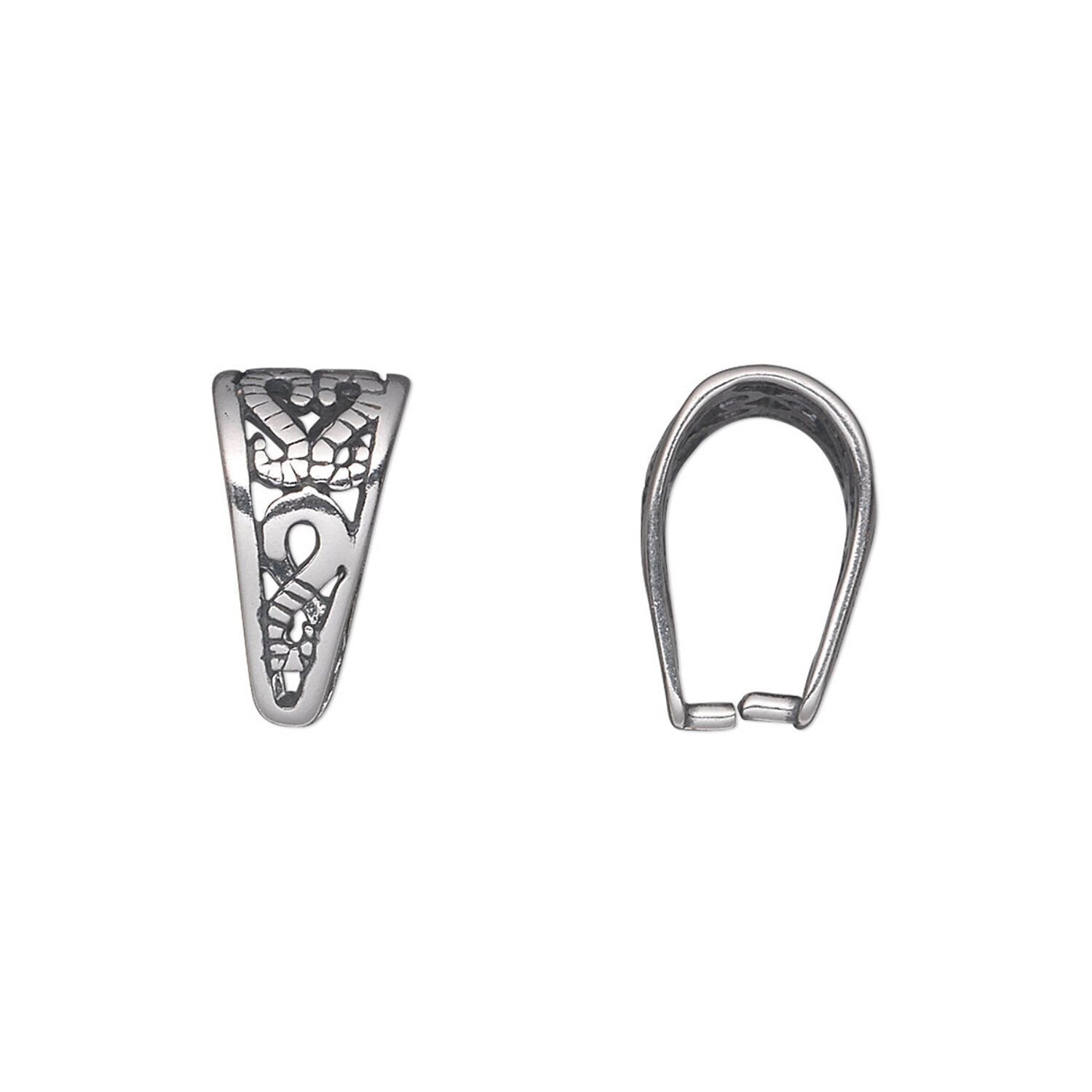Antiqued sterling silver ice-pick bail attaches into the loop or drill hole of a focal or drop to string onto chain, cord or wire.