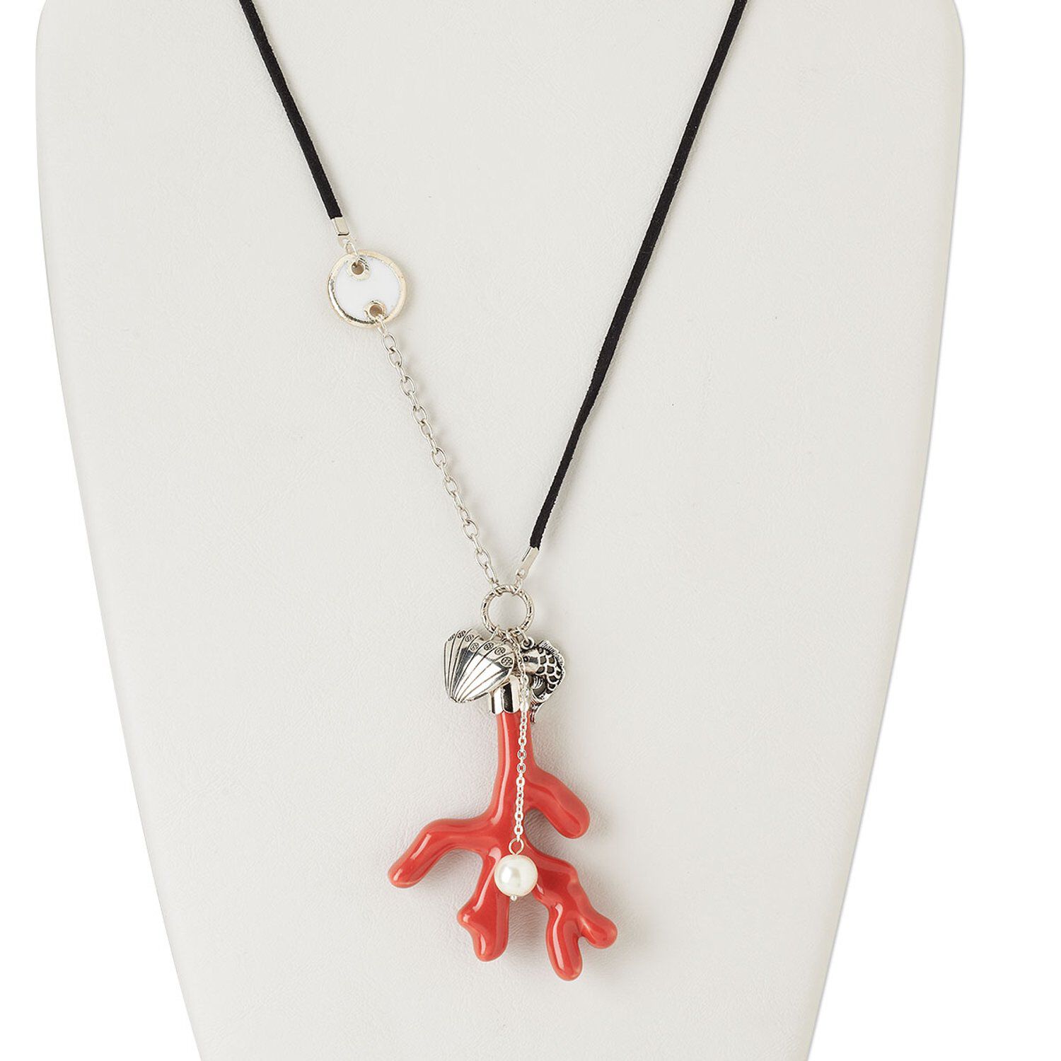 Necklace, porcelain / steel / "pewter" (zinc-based alloy) / silver-colored plastic / acrylic / faux suede, multicolored, 70x30mm coral branch, fish and shell charm, pearl and flat round, adjustable up to 32 inches, continuous loop. Sold individually.