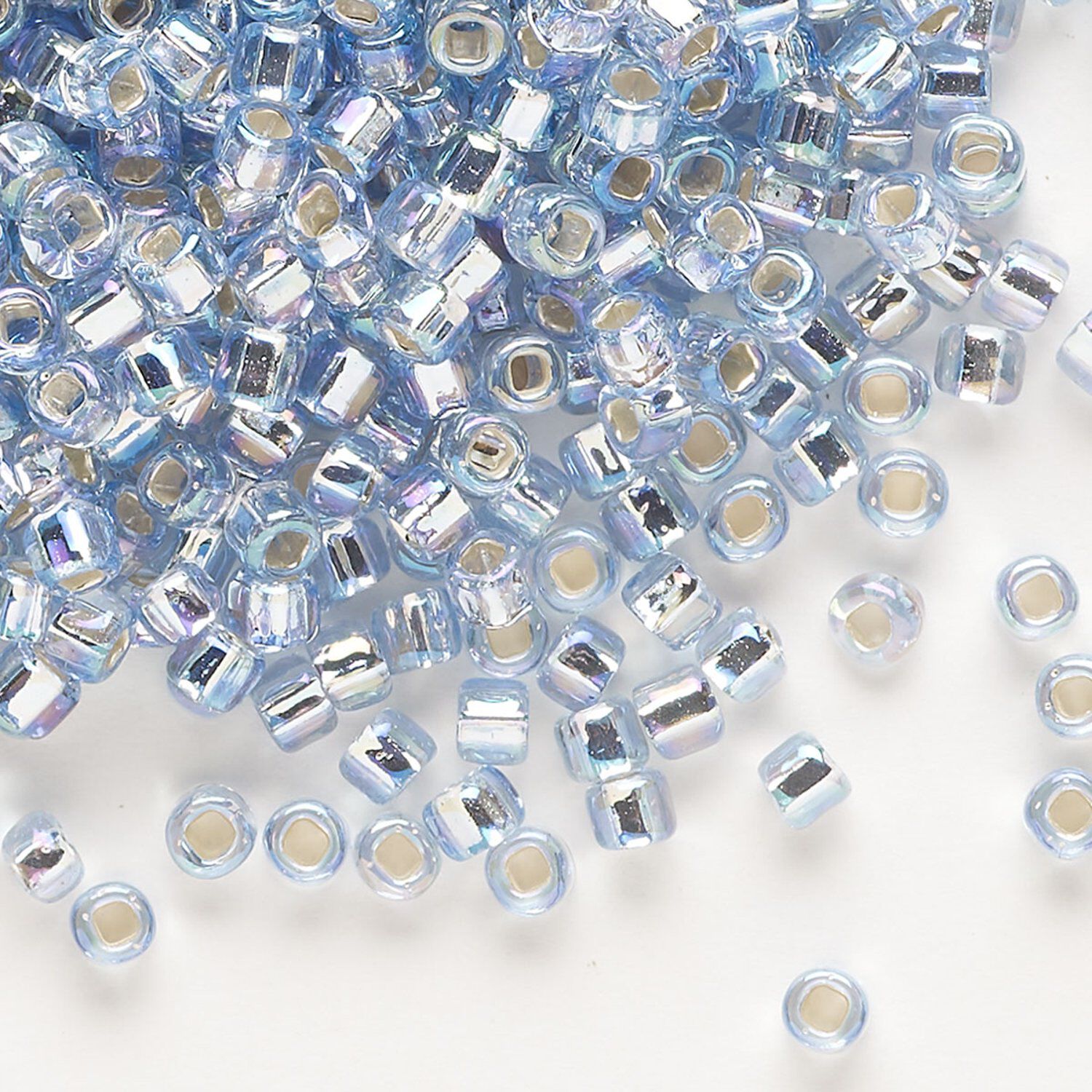 Seed bead, Dyna-Mites™, glass, silver-lined translucent rainbow light grey, #6 round with square hole. Sold per 1/2 kilogram pkg.