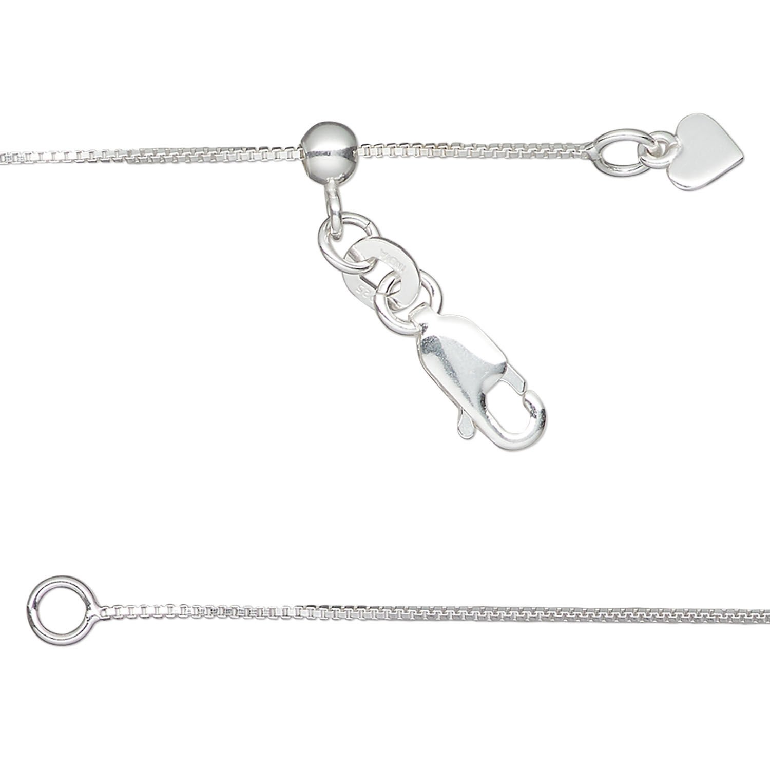 Sterling silver box chain with crisp square links. The slim 0.7mm chain adjusts from 16 to 24 inches with a smooth-gliding bead, perfect for lightweight designs.