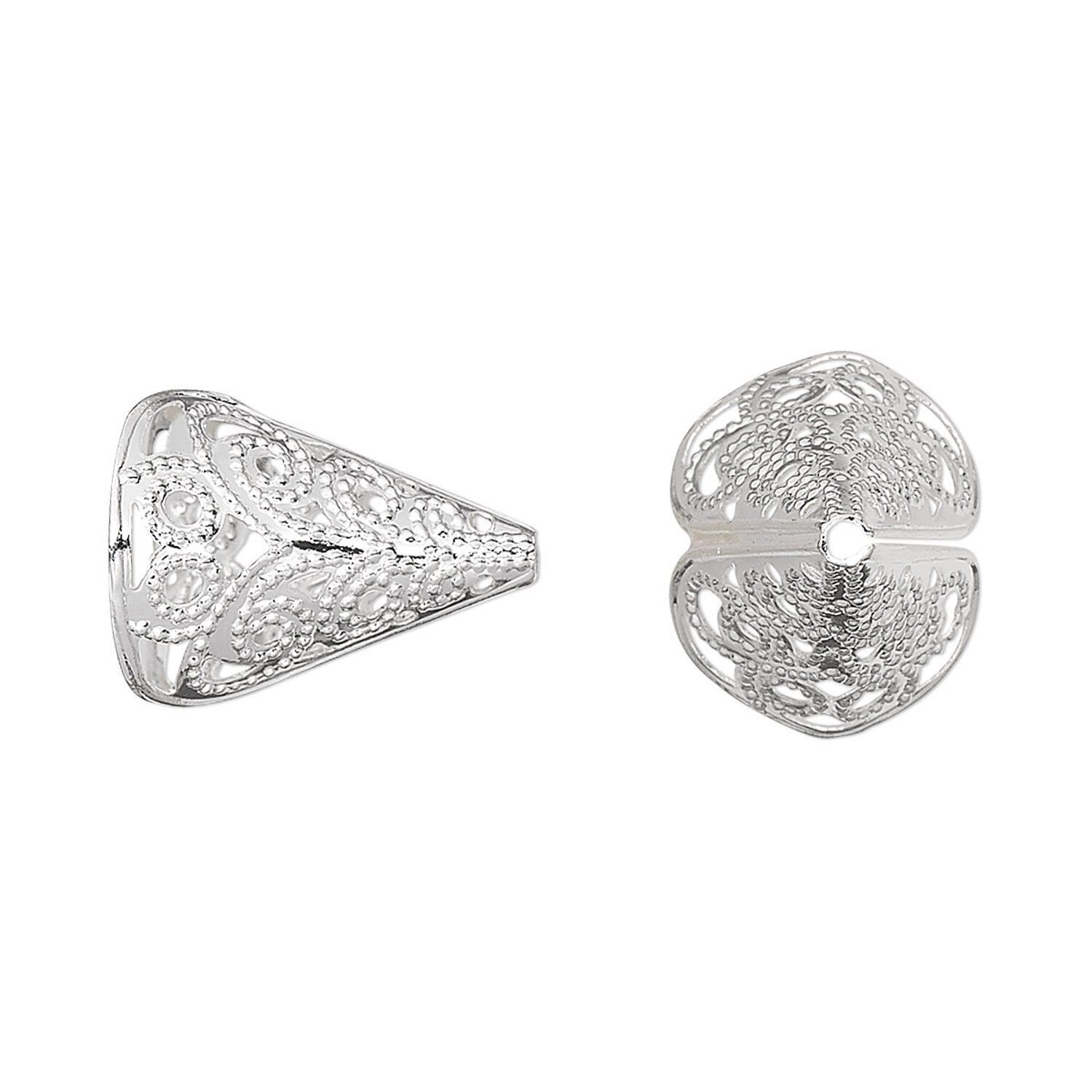 Cone, silver-plated brass, 16mm fancy filigree, 13x10mm inside diameter. Sold per pkg of 100.