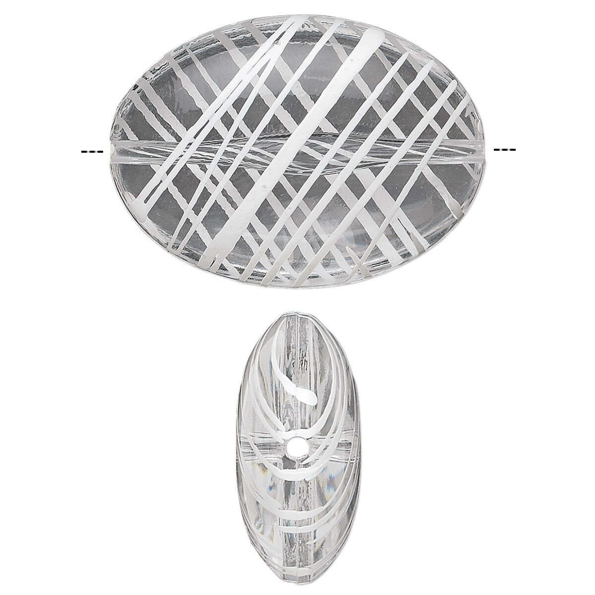 Bead, acrylic, semitransparent clear and white, 33x24mm puffed oval with painted line design. Sold per pkg of 18.