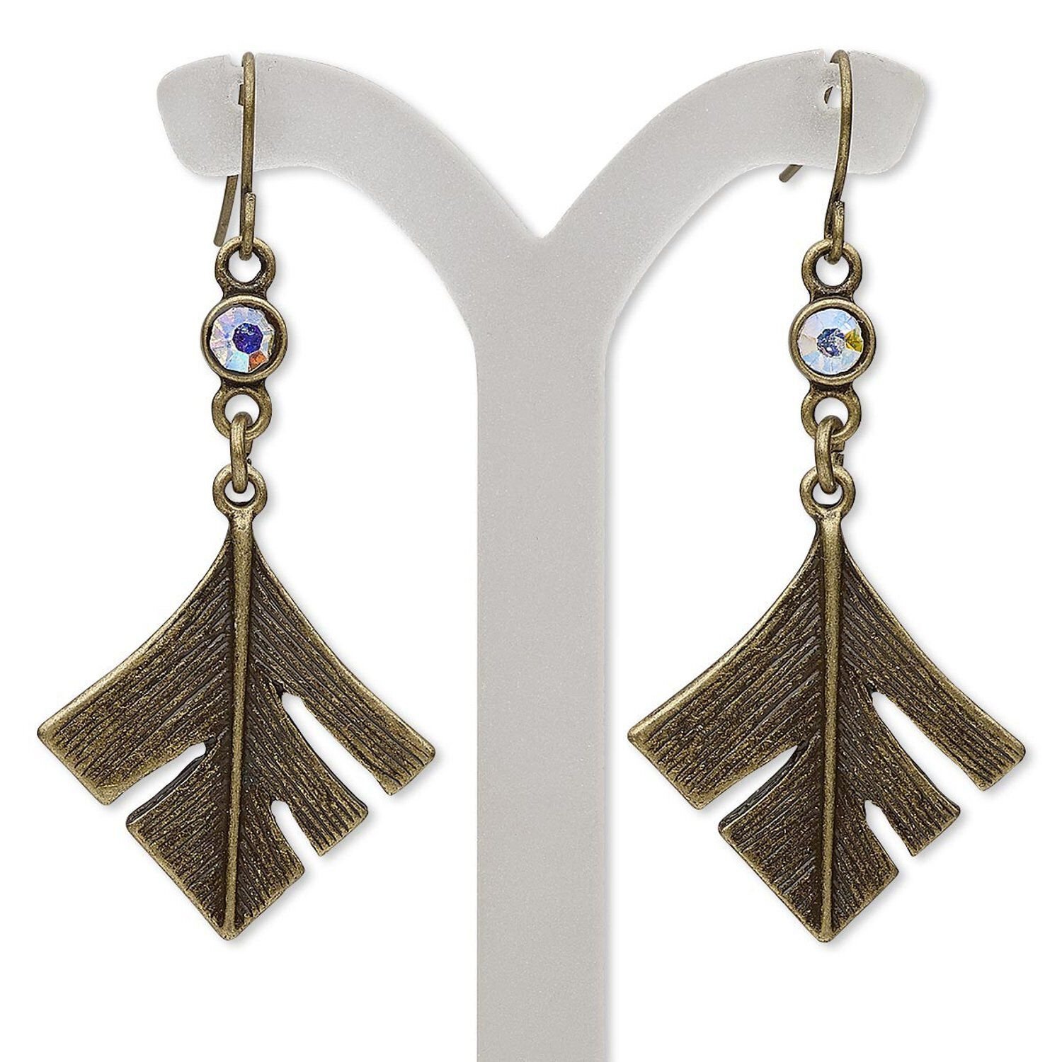 Earring, glass rhinestone with antique brass-finished brass and "pewter" (zinc-based alloy), clear AB, 2 inches with diamond feather and fishhook ear wire. Sold per pair.