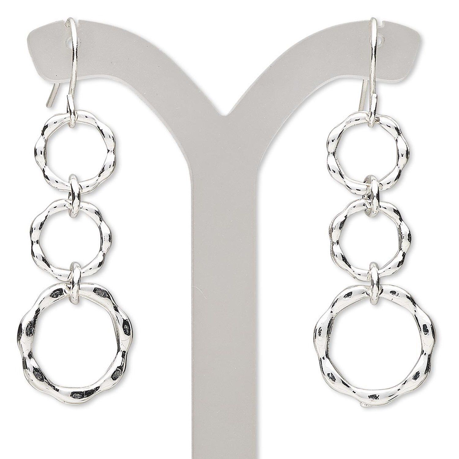 Earrings feature 3 textured rings stacked in a linked design. Ready-to-wear earrings make great retail displays.
