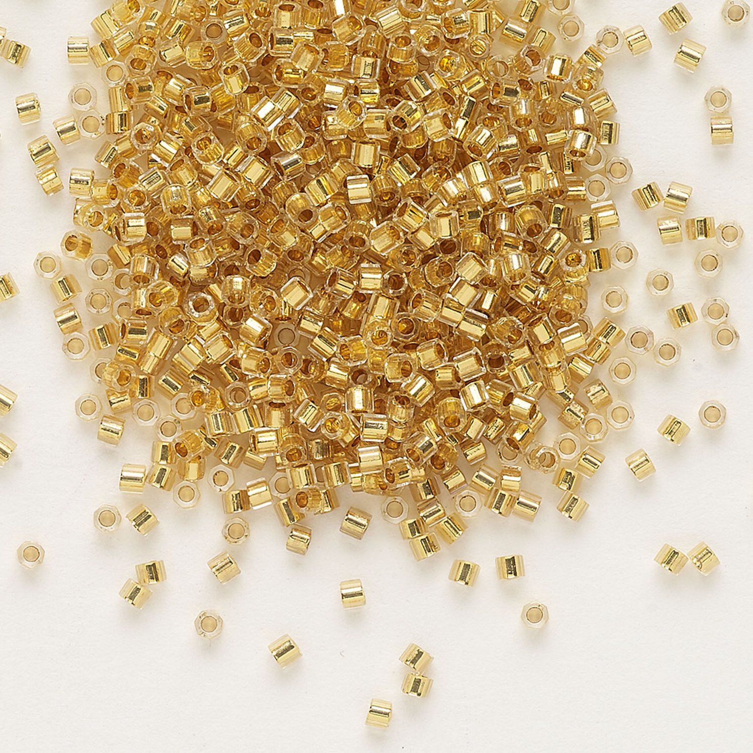 Seed bead, Delica®, glass, pkg/250g, #11 cut, transparent 24Kt gold-lined crystal gold (DBC-0033).