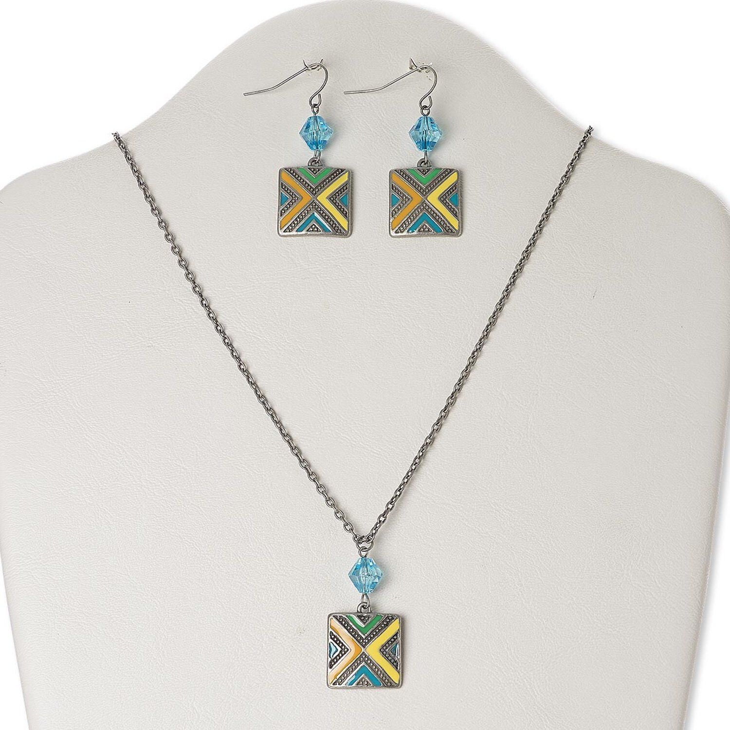 Versatile and artistic necklace brings eye-catching flair to your wardrobe or fashion displays. This necklace and earring features antiqued silver-finished "pewter" (zinc-based alloy) squares with multicolored enamel.