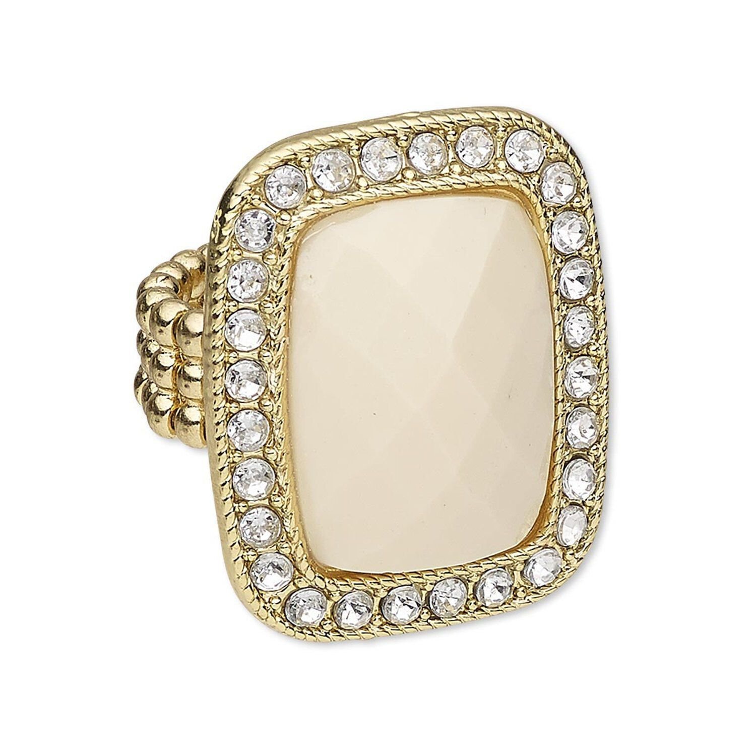 Ring, stretch, acrylic / glass rhinestone / gold-finished "pewter" (zinc-based alloy), cream and clear, 30x25mm rectangle, size 7. Sold individually.