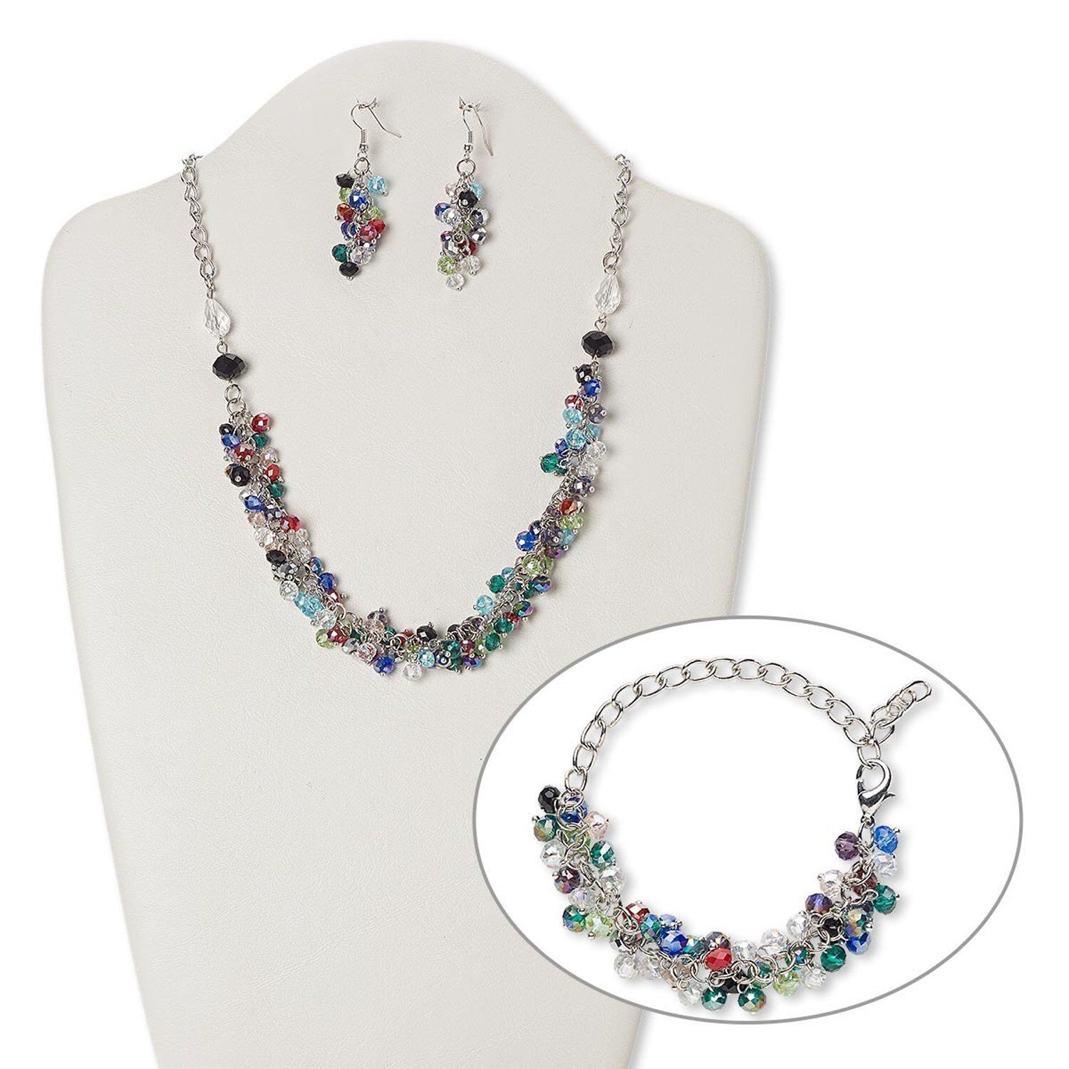 Necklace features multicolored glass faceted rondelles and clear teardrops with matching bracelet and earrings.